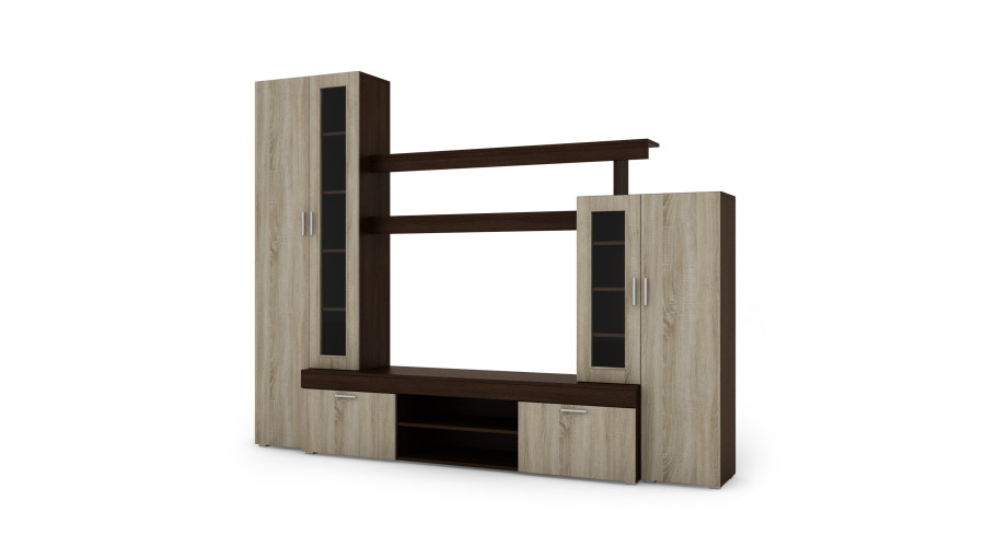 Komplektą sudaro spintelės, lentynos ir vitrina, skirta laikyti ir eksponuoti knygas, dekoracijas ir kasdienius daiktus. Stiklinė vitrina leidžia eksponuoti pasirinktus daiktus, išlaikant viso sieninio bloko vizualinį lengvumą ir tvarką erdvėje.