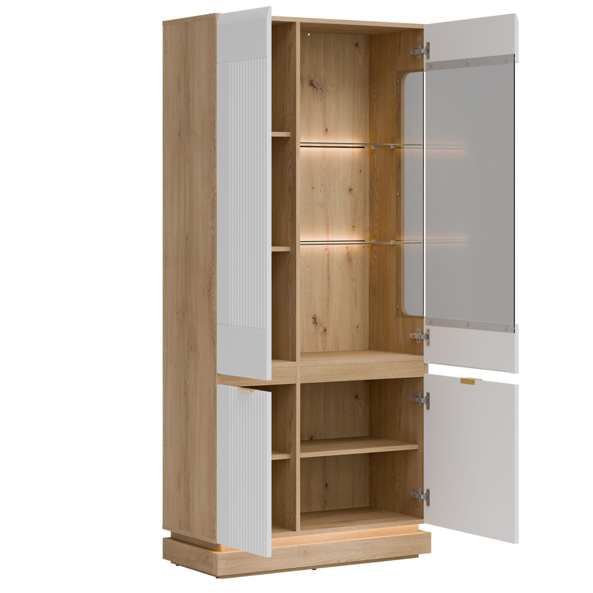 „MILTON“ kolekcijos vitrina „ML06“ yra išplėstinė „ML05“ modelio versija, kurioje dera modernus dizainas ir maksimalus funkcionalumas. Matinės MDF plokštės, kurias galima įsigyti įvairių spalvų, apačioje yra subtilios vertikalios frezos, suteikiančios elegancijos. Minimalistinės auksinės rankenėlės suteikia stilingą užbaigtumą, o pasirenkamas LED apšvietimas vitrinos srityje pabrėžia modernią formą ir sukuria jaukią atmosferą. Stiklinė viršutinė dalis puikiai tinka dekoracijoms, stikliniams indams ar kolekciniams daiktams eksponuoti, o užrakinamos apatinės spintelės suteikia daug vietos daiktams susidėti, padedančios viską tvarkingai laikyti. „Cremona Torro Oak“ apdaila suteikia vizualinės šilumos ir gražiai dera su bet kokia fasadų spalva, sukurdama darnią ir elegantišką kompoziciją. Dėl švelnaus uždarymo sistemos vitrina yra patogi ir tyli naudoti. Šis baldas puikiai tiks svetainėje, valgomajame ar modernioje virtuvėje, suteikdamas interjerui harmonijos, klasės ir nesenstančio stiliaus.