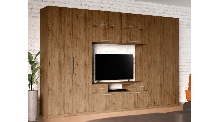 Moderni sieninė spintelė su didelėmis spintomis, lentynomis, televizoriumi ir stalčiais, 350 × 227 cm, Dab Lefkas – SCANDI