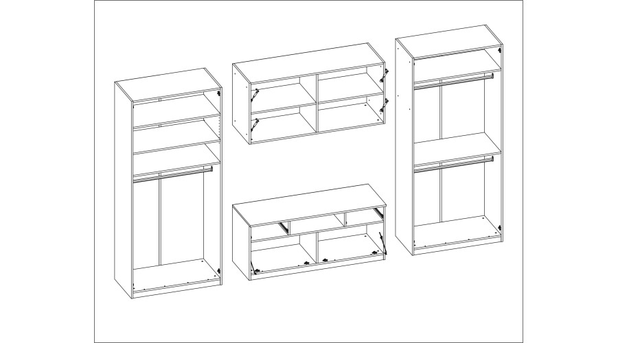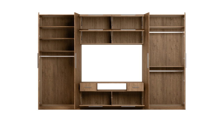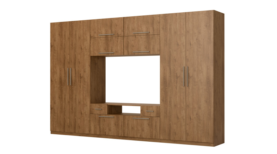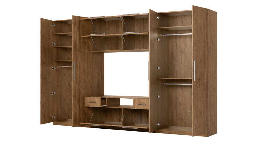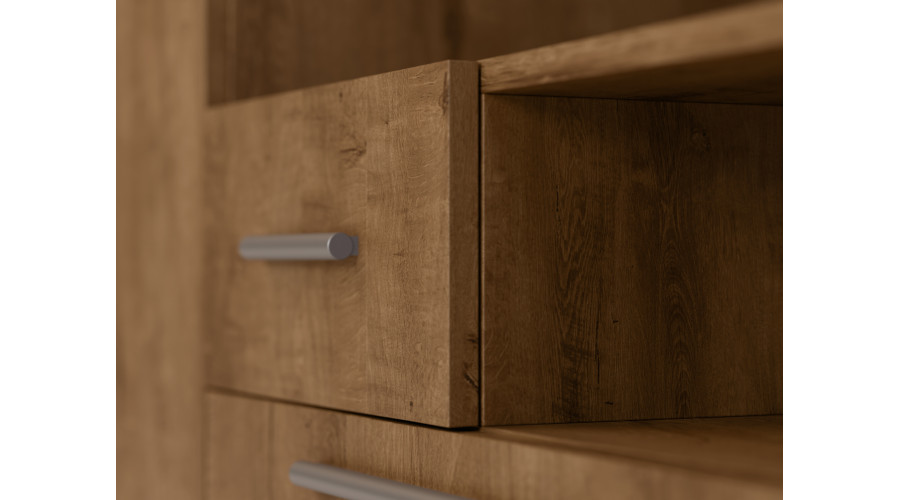 Komplektas siūlo daug vietos daiktams susidėti, todėl galėsite palaikyti tvarką net ir dažnai naudojamose erdvėse. Uždarose spintose rasite vietos drabužiams, tekstilės gaminiams ar rečiau naudojamiems daiktams, o lentynos ir stalčiai leidžia patogiai susitvarkyti smulkius aksesuarus, dokumentus ir dekoratyvinius elementus. Dėl apgalvoto išdėstymo visi reikalingi daiktai yra po ranka, neatrodant chaotiškai.