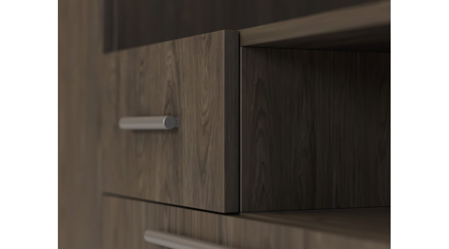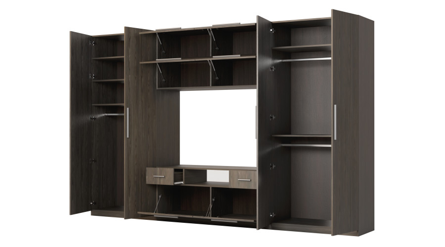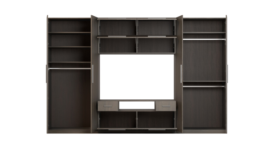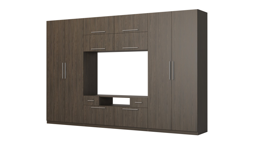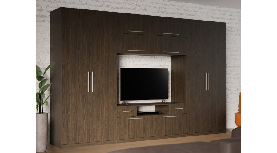 Centrinė sieninės spintelės dalis suprojektuota kaip funkcionali televizoriaus zona. Televizoriui ir garso bei vaizdo įrangai skirta vieta sukuria stilingą ir darnų multimedijos kampelį, kuriame nėra laidų ir priedų raizgalynės. Gerai apgalvotas atvirų ir uždarų erdvių išdėstymas skatina tvarką, o viršutinis praplatinimas padidina spintelės talpą ir leidžia efektyviai išnaudoti kambario aukštį, nereikia tvirtinti elementų prie sienos.