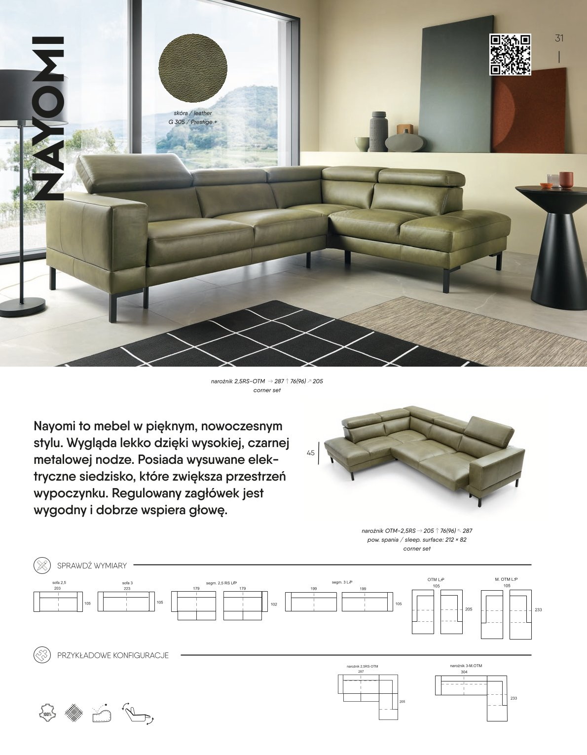 „Nayomi“ kampinė sofa siūloma 2.5RS-OTM konfigūracijos, kairės arba dešinės (L/R) versijose, todėl galite ją pritaikyti prie savo kambario išplanavimo. Sėdynė pagaminta iš vingiuotų spyruoklių, didelio elastingumo putų ir poliuretano putų derinio, užtikrinančio patvarumą ir atsparumą deformacijai. Atlošas turi elastinius dirželius ir poliuretano putas, užtikrinančias pakankamą elastingumą ir komfortą.