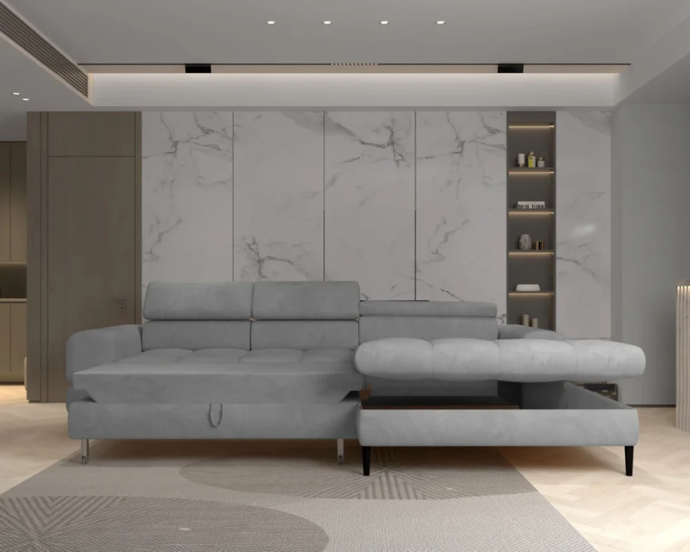 Kampinė sofa „Voss S“ pasižymi daugybe funkcijų, kurios tikrai patiks ieškantiems praktiškų sprendimų savo svetainei. Viena iš šių savybių – miegojimo funkcija, pagrįsta delfinų sistema – šis mechanizmas leidžia greitai ir efektyviai transformuoti kampinę sofą į patogią 226 cm ilgio ir 140 cm pločio lovą. Tai puikus pasirinkimas tiems, kurie nori svečiams pasiūlyti pilno dydžio poilsio vietą, nereikalaujant atskiro miegamojo. Kampinėje sofoje taip pat yra patalynės skyrius, kuris leidžia lengvai palaikyti tvarką kambaryje ir laikyti būtiniausius daiktus po ranka.