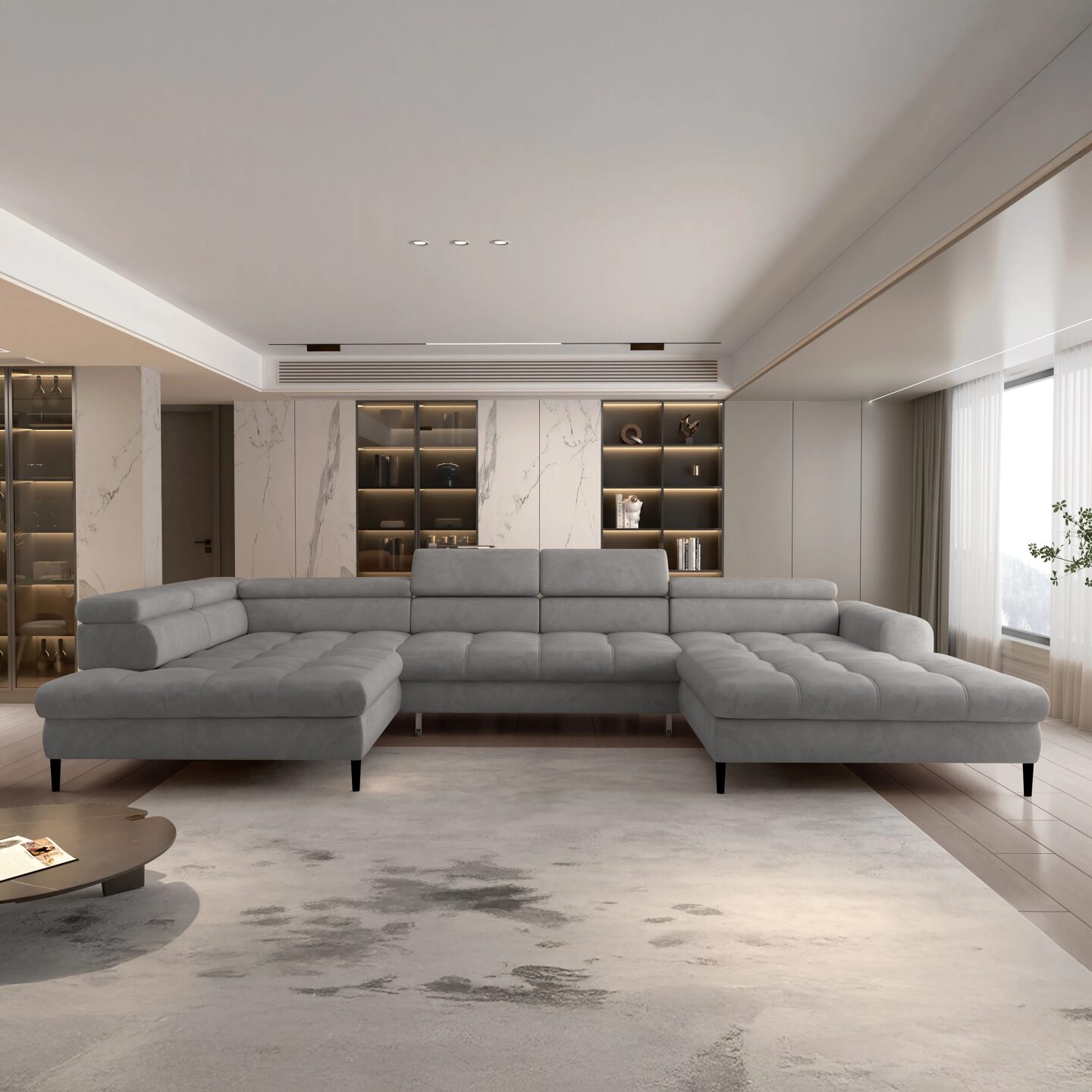 „Voss XL“ kampinė sofa sujungia modernų dizainą, prabangų komfortą ir įspūdingą funkcionalumą, sukurta didelėms, elegantiškoms svetainėms. Elegantiška, subtiliai apvali forma ir rafinuotos detalės paverčia ją kambario traukos centru. Ji turi miegojimo funkciją, patalynės dėžę, reguliuojamas galvos atramas, stumdomas atlošus ir patvarias vingiuotas spyruokles su didelio elastingumo putomis, kurios užtikrina maksimalų komfortą kasdieniam poilsiui. Laisvai stovinti konstrukcija leidžia kampinę sofą pastatyti net kambario centre, išlaikant elegantišką išvaizdą iš bet kurio kampo. Tai puikus pasirinkimas tiems, kurie iš savo baldų tikisi aukščiausio lygio funkcionalumo ir stiliaus.