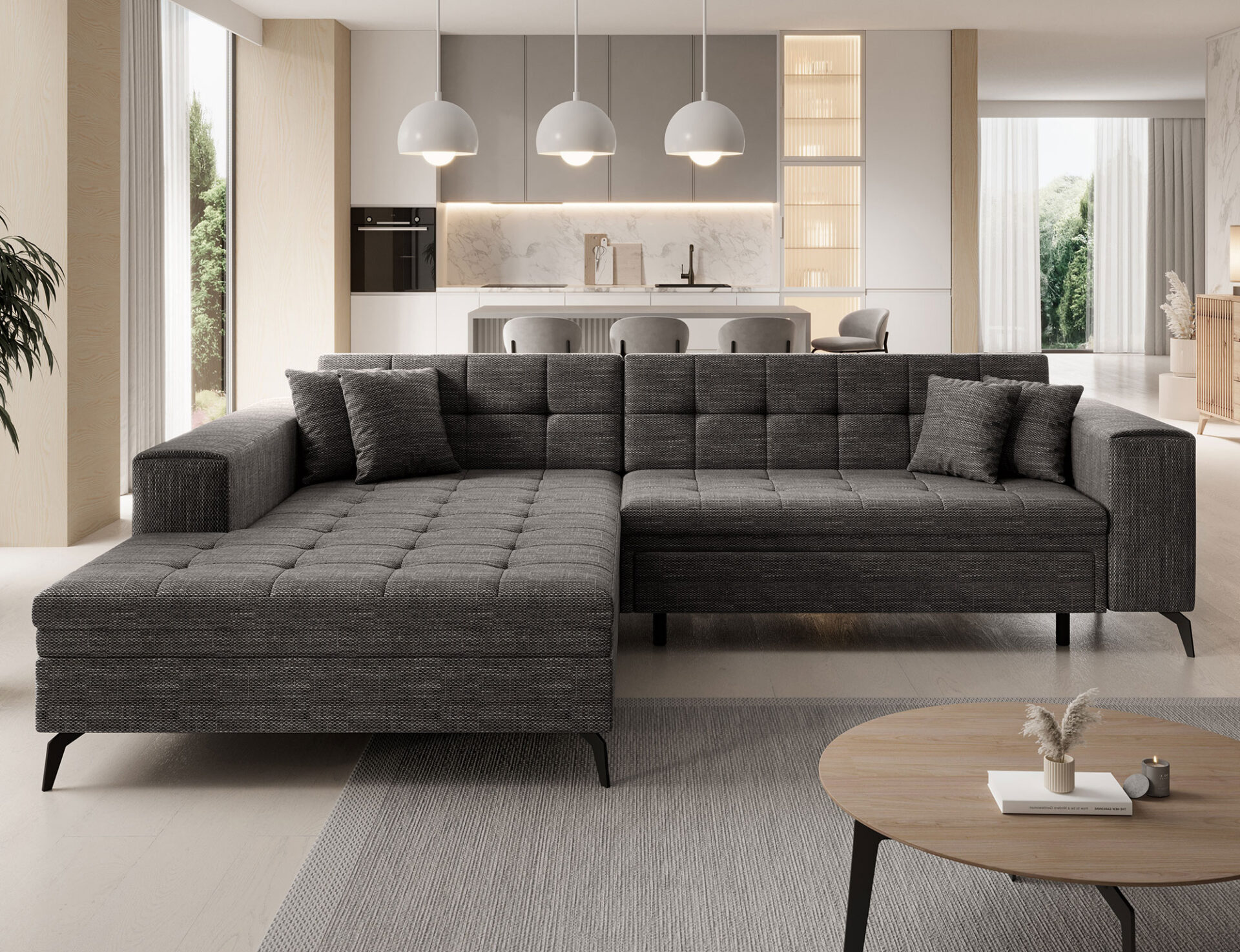 „Solange“ – unikali, skoninga ir išskirtinai minkšta kampinė sofa, kuri bet kokiam interjerui suteikia gaivumo ir prabangos. 292 x 196 x 80 cm dydžio sofa garantuoja maksimalų komfortą visai šeimai tiek dieną, tiek naktį, nes joje yra miegojimo funkcija, o paviršiaus plotas – 210 x 126 cm. Delfino mechanizmas taip pat padeda lengvai atlošti sofą į norimą padėtį. Gilios sėdynės su ilgu pufu, užpildytu vingiuotomis spyruoklėmis ir T30 putomis, ne tik palaiko taisyklingą laikyseną, bet ir užtikrina sofos atsparumą deformacijai. Kampinė sofa siūloma įvairių spalvų, todėl galite rinktis tinkamiausią baldą ir įrengti svetainę pagal savo individualų stilių.