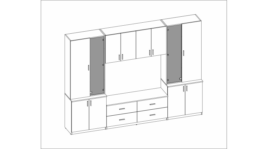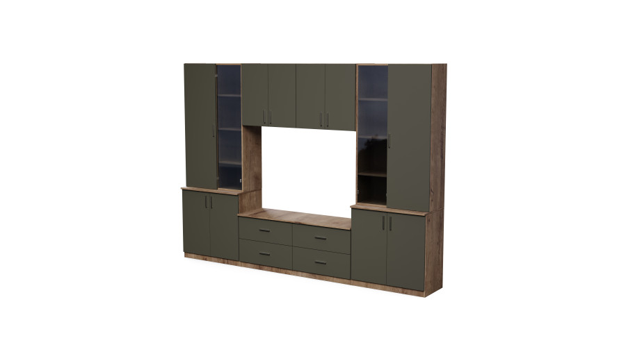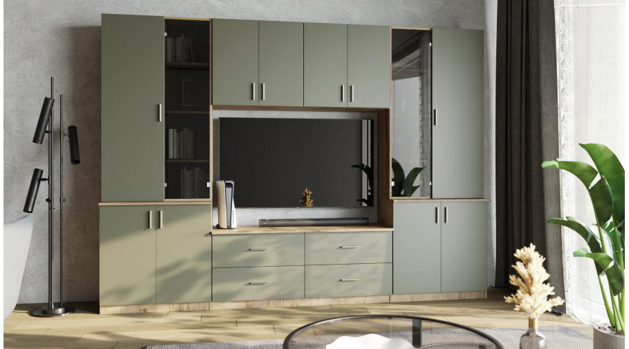 Centrinė televizoriaus lentyna sukuria funkcionalią multimedijos zoną, kurioje patogu išdėstyti ekraną ir elektroniką. Spintelių ir erdvių stalčių išdėstymas leidžia praktiškai laikyti kasdienius daiktus – nuo dokumentų ir aksesuarų iki tekstilės gaminių ir baldų, kuriuos pravartu turėti po ranka, bet paslėpti.