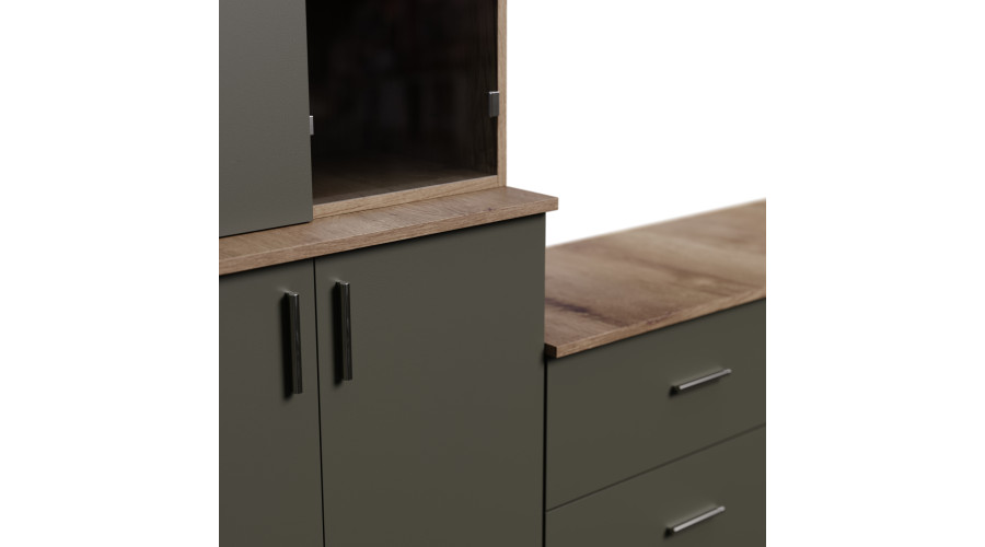„STILO“ sieninė spintelė „Lefkas Oak“ ir grafito pilkos spalvos – tai modernus svetainės baldų komplektas, kuriame natūrali medžio spalva derinama su išskirtiniu, tamsiu akcentu. Šis spalvų derinys suteikia baldui išskirtinio charakterio ir puikiai tinka moderniam, lofto ir industrinio stiliaus svetainės dizainui.
