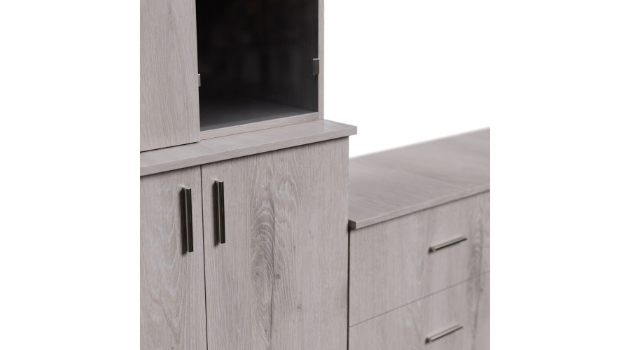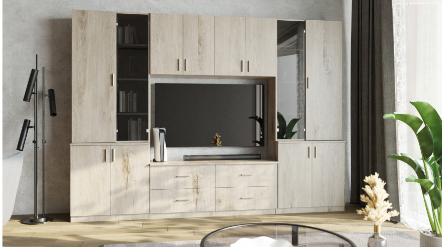 Centrinė televizoriaus lentyna sukurta kaip patogi ir estetiškai patraukli multimedijos zona. Ji leidžia patogiai išdėstyti ekraną ir elektroniką, išlaikant viso komplekto vizualinę darną. Užrakinamos spintelės ir erdvūs stalčiai suteikia praktišką vietą dokumentams, aksesuarams, žaidimams ir kitiems baldams, kuriuos pravartu turėti po ranka, bet paslėpti.
