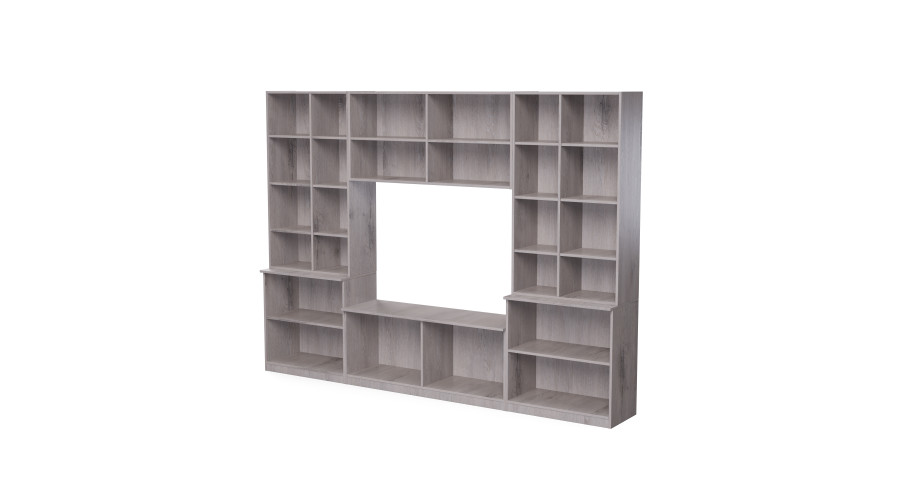 Svetainės spintelė su TV lentyna, spintelėmis ir stalčiais, 300 × 220 cm, „Lumberjack Frost Oak“ – STILO