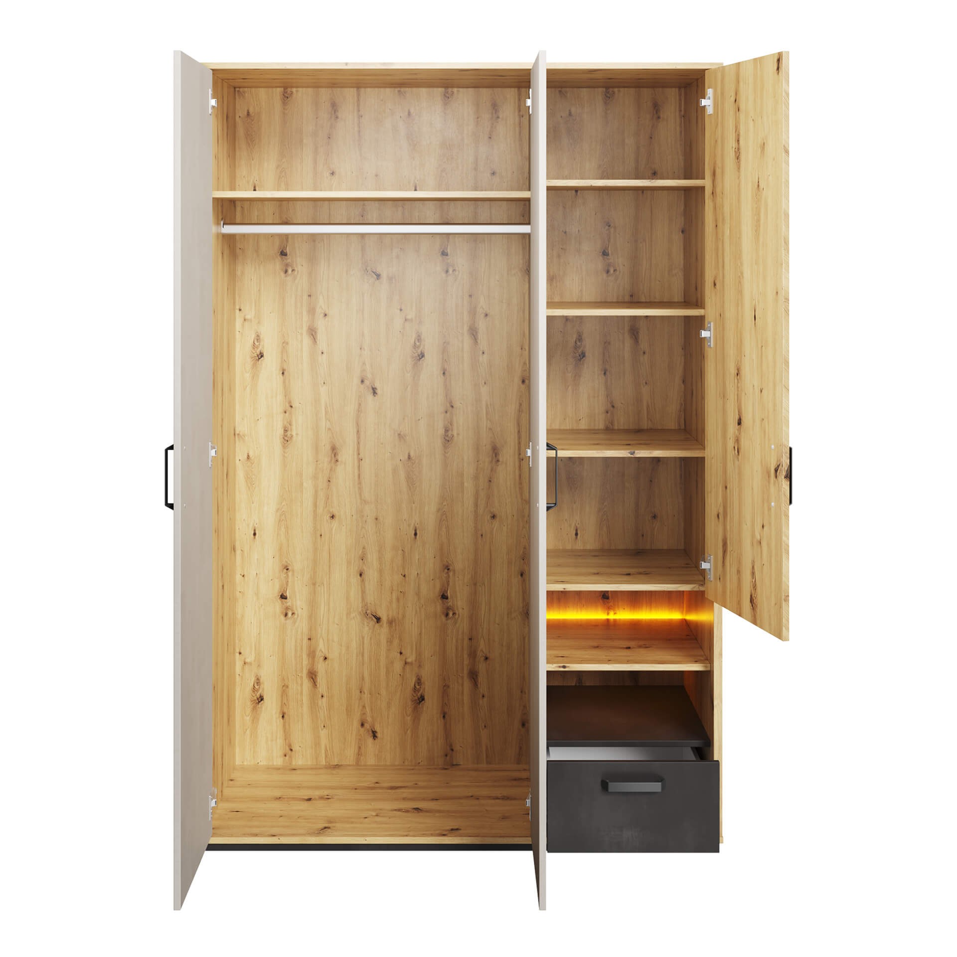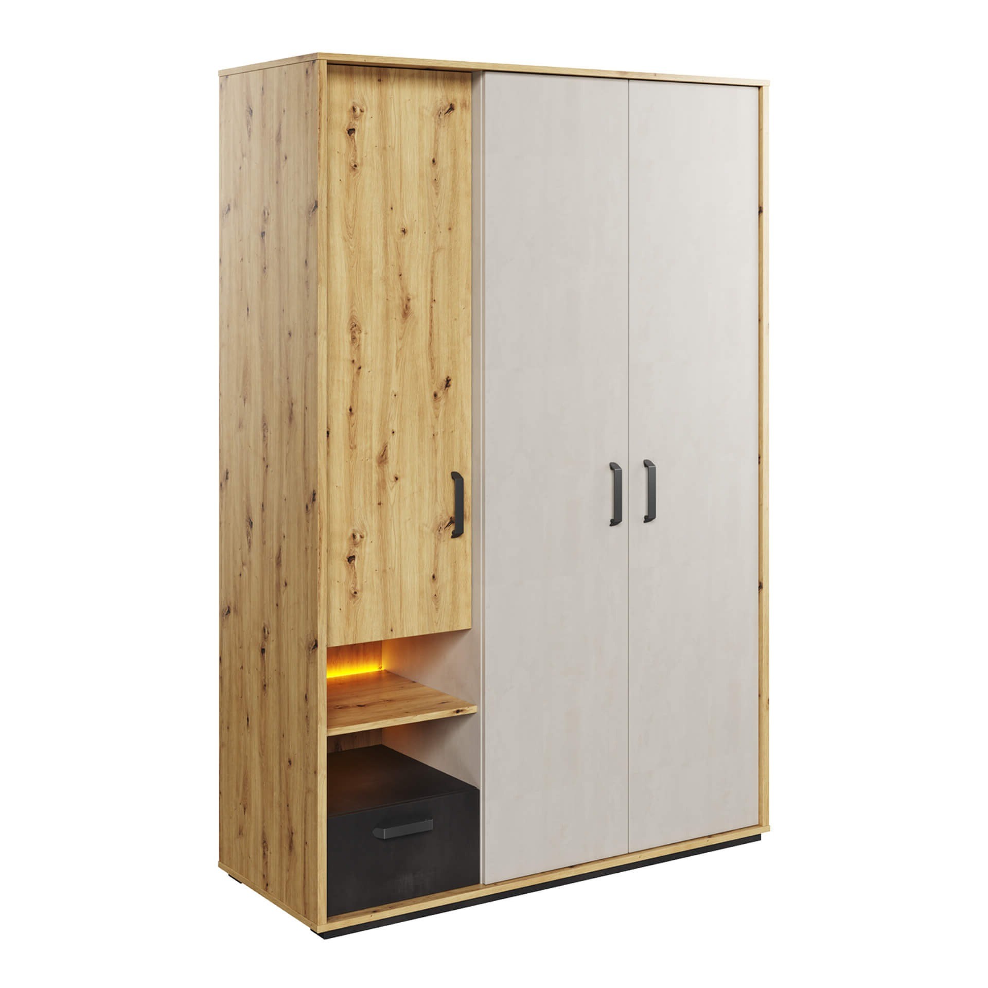 Modelis: QB-02 Spalva: artisan ąžuolas / šilko pilka / neapdorotas plienas Matmenys: Plotis: 130 cm Aukštis: 195 cm Gylis: 55 cm Pagrindinė informacija: korpuso pavadinimas: QB-2 kolekcijos pavadinimas: QUBIC korpuso indeksas: QB2DAR spalvos: artisan ąžuolas / šilko pilka / neapdorotas plienas Baldo tipas: spinta Korpuso charakteristikos: 3D1S Plotis: 130 cm Aukštis: 195 cm Gylis: 52 cm Korpuso svoris: 104 kg Surinkimas: reikalingas surinkimas Kolekcijos stilius: modernus Interjero tipas 1: Jaunimo kambarys Įranga: 1x karnizas, 3x lentyna Stalčių skaičius: 1 Durų skaičius: 3 Furnitūra: Vyris: paslėptas įprastas Rankena: metalinis Stalčiaus bėgelis: rutulinis guolis Pėda / koja: bėgelis su vinimis Apšvietimas įtrauktas: yra Apšvietimo tipas: LED juostelė Medžiaga: korpusas: laminuota medžio drožlių plokštė; 16 mm; 22 mm Korpuso kraštų apdaila: A 0,45 mm; S 1,70 mm Korpuso spalva: artisan ąžuolas / neapdorotas plienas / šilko pilka Viršus: laminuota medžio drožlių plokštė; 16 mm viršutinės briaunos apdaila: S 1,70 mm klijuotų viršutinių briaunų skaičius: 4 viršutinė spalva: artistiškas ąžuolas galinė sienelė: HDF plokštė; 3 mm matomos galinės sienelės dalies apdaila: laminatas nematomos galinės sienelės dalies apdaila: neapdorota galinės sienos tvirtinimas: „nuta“ galinės sienelės spalva: artistiškas ąžuolas lentyna: laminuota medžio drožlių plokštė; 16 mm lentynos krašto apdaila: A 0,45 mm klijuotų lentynos kraštų skaičius: 1 leistina lentynos apkrova: 5 kg lentynos spalva: artistiškas ąžuolas lentynų skaičius: 3 priekinė dalis: laminuota medžio drožlių plokštė; 16 mm priekinio krašto apdaila: S 1,70 mm priekinės dalies spalva: artistiškas ąžuolas/šilkinė danga/neapdorotas plienas stalčiaus vidinė apdaila: balta juostelė stalčiaus dugnas: HDF plokštė; 3 mm svarbu: ši spinta gaminama pagal užsakymą. Užsakymo atšaukti negalima praėjus 48 valandoms nuo pateikimo. Prašome apsipirkti atidžiai.