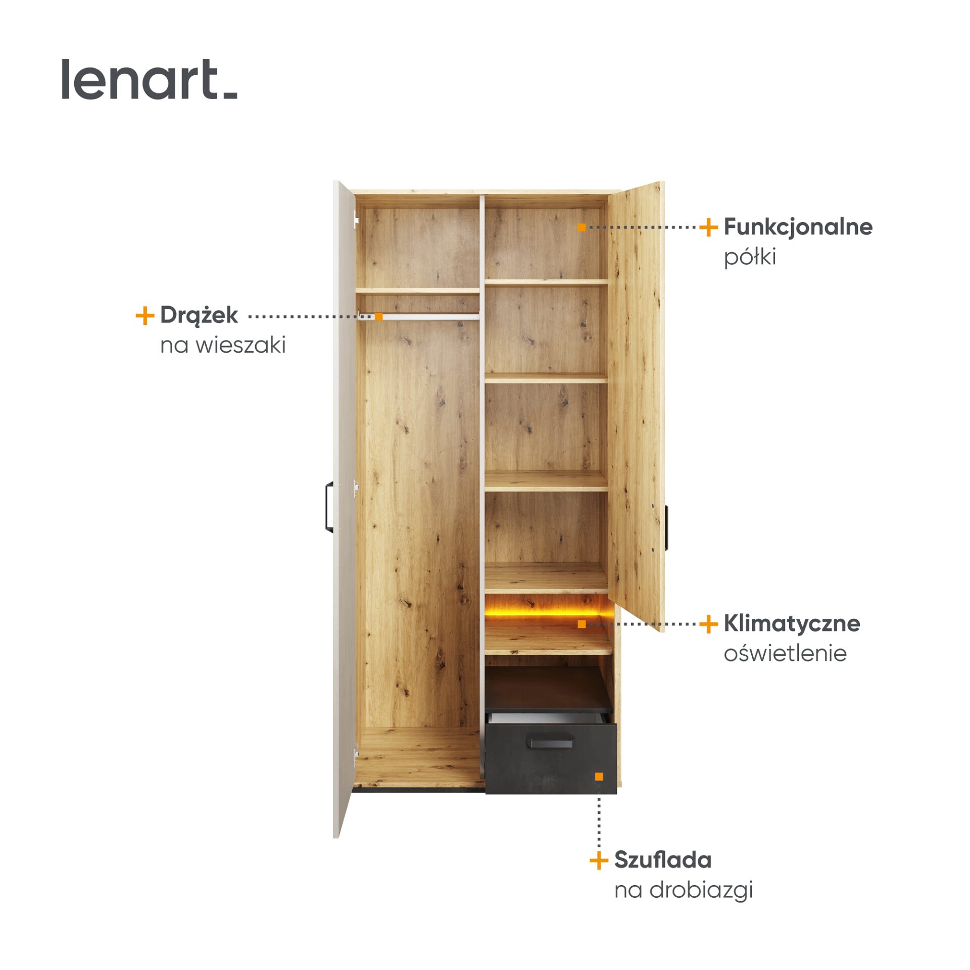 Modelis: QB-03 Spalva: artisan ąžuolas / šilko pilka / neapdorotas plienas Matmenys: Plotis: 90 cm Aukštis: 195 cm Gylis: 52 cm Pagrindinė informacija: korpuso pavadinimas: QB-3 kolekcijos pavadinimas: QUBIC korpuso indeksas: QB3DAR spalvos: artisan ąžuolas / šilko pilka / neapdorotas plienas Baldo tipas: spinta Korpuso charakteristikos: 2D1S Plotis: 90 cm Aukštis: 195 cm Gylis: 52 cm Korpuso svoris: 87 kg Surinkimas: reikalingas surinkimas Kolekcijos stilius: modernus Interjero tipas 1: jaunimo kambarys Įranga: 1x karnizas, 3x lentyna Stalčių skaičius: 1 Durų skaičius: 2 Furnitūra: Vyris: paslėptas įprastas Rankena: metalinis Stalčiaus bėgelis: rutulinis guolis Pėda / koja: bėgelis su vinimis Apšvietimas komplekte: yra Apšvietimo tipas: LED juostelė Medžiaga: korpusas: laminuota medžio drožlių plokštė; 16 mm; 22 mm Korpuso kraštų apdaila: A 0,45 mm; S 1,70 mm Korpuso spalva: artisan ąžuolas / neapdorotas plienas / šilko pilka Viršus: laminuota medžio drožlių plokštė; 16 mm viršutinės briaunos apdaila: S 1,70 mm klijuotų viršutinių briaunų skaičius: 4 viršutinė spalva: artistiškas ąžuolas galinė sienelė: HDF plokštė; 3 mm matomos galinės sienelės dalies apdaila: laminatas nematomos galinės sienelės dalies apdaila: neapdorota galinės sienos tvirtinimas: „nuta“ galinės sienelės spalva: artistiškas ąžuolas lentyna: laminuota medžio drožlių plokštė; 16 mm lentynos krašto apdaila: A 0,45 mm klijuotų lentynos kraštų skaičius: 1 leistina lentynos apkrova: 5 kg lentynos spalva: artistiškas ąžuolas lentynų skaičius: 3 priekinė dalis: laminuota medžio drožlių plokštė; 16 mm priekinio krašto apdaila: S 1,70 mm priekinės dalies spalva: artistiškas ąžuolas/šilkinė danga/neapdorotas plienas stalčiaus vidinė apdaila: balta juostelė stalčiaus dugnas: HDF plokštė; 3 mm svarbu: ši spinta gaminama pagal užsakymą. Užsakymo atšaukti negalima praėjus 48 valandoms nuo pateikimo. Prašome apsipirkti atidžiai.