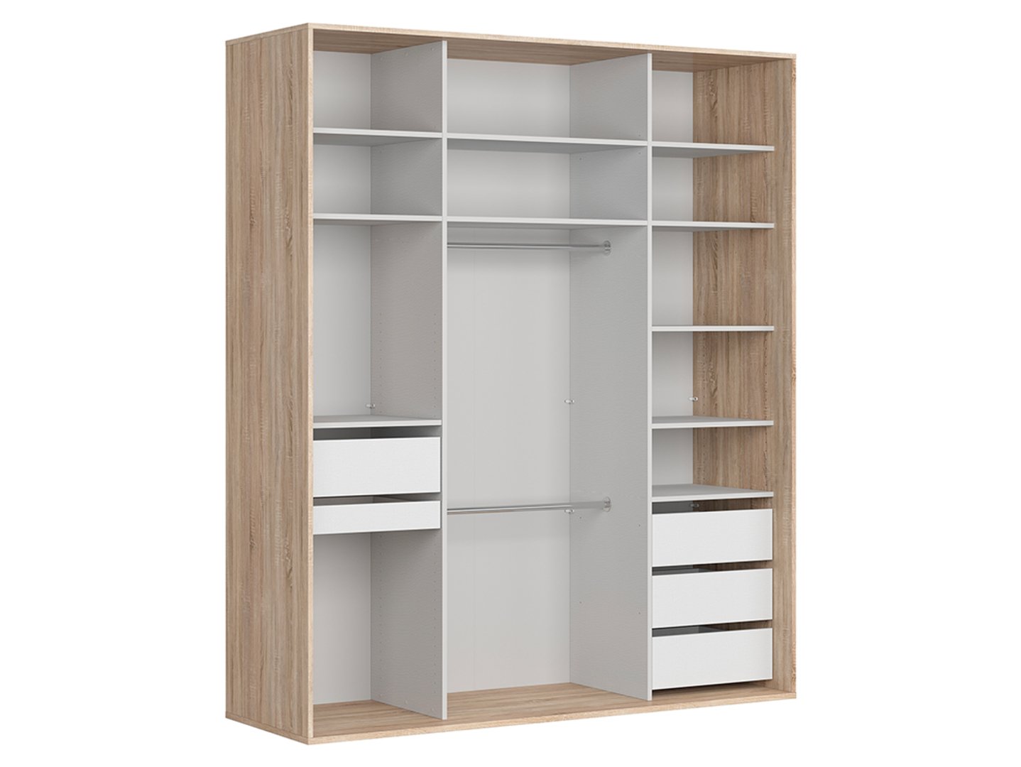 „Flex“ spinta – unikalus stiliaus ir funkcionalumo derinys. Jūsų miegamasis yra atsipalaidavimo ir atsigavimo vieta, o „Flex“ spinta yra puikus sprendimas, užtikrinantis harmoniją jame ir erdvės organizavimą. Atraskite, kaip elegantiškas dizainas ir patogus daiktų laikymo būdas dera šiame išskirtiniame balde. Ši stumdoma spinta, kurios matmenys yra 200,7 x 240 x 66 cm, ne tik taupo erdvę, bet ir suteikia elegancijos bei funkcionalumo visam miegamajam. Šviesi sonoma ąžuolo medienos spalva suteikia kambariui jaukumo, sukurdama tobulą foną poilsiui. Spintos fasadai yra tikri meno kūriniai, kuriuose derinami dideli veidrodiniai paviršiai su sonoma ąžuolo mediena. Didelis veidrodis suteikia erdvės ir į kambarį įleidžia natūralios šviesos. Sonoma ąžuolo durys suteikia šilumos ir ramybės, sukurdamos tobulą aplinką jūsų drabužiams. Spintos vidus sukurtas atsižvelgiant į maksimalų funkcionalumą. Dešimt lentynų leidžia tvarkingai susidėti palaidines, megztinius ir namų tekstilę. Du pakabos bėgeliai yra puiki vieta marškiniams ir striukėms. Be to, ištraukiama kelnių pakaba leidžia lengvai palaikyti tvarką. Trys stalčiai siūlo praktišką sprendimą smulkiems drabužių spintos daiktams ir aksesuarams. Rutuliniai guoliai leidžia visiškai ištraukti stalčius, o švelnaus uždarymo funkcija leidžia naudotis spinta nepaprastai maloniai. Durys su stabdžiais užtikrina švelnų uždarymą ir atidarymą, taip padidindamos baldo ilgaamžiškumą. Spinta „Flex“ – tai ne tik daiktų laikymo sprendimas, bet ir dekoratyvinis elementas, kuris tiks įvairiems interjerams. Universalus dizainas tinka tiek klasikiniam, tiek moderniam interjerui, sukurdamas stilingą ir funkcionalią erdvę.
