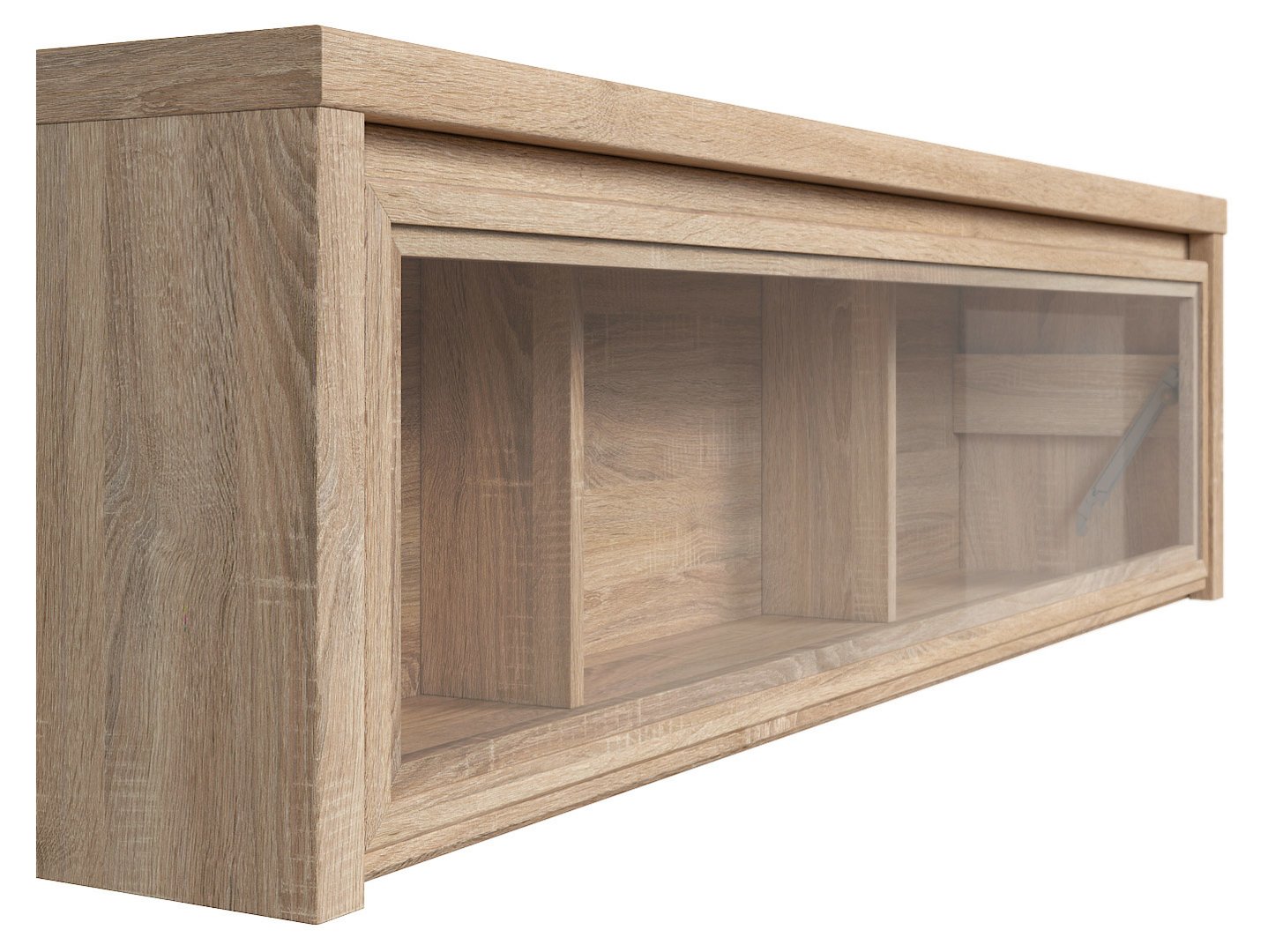 „Kaspian“ pakabinama vitrina išsiskiria savo fanera, kuri tiksliai atkuria neapdorotos medienos struktūrą ir raštą. Ši detalė suteikia spintelei charakterio ir jaukumo, kartu išlaikant modernią išvaizdą. Sustiprinta konstrukcija su vertikaliu vidiniu padalinimu.