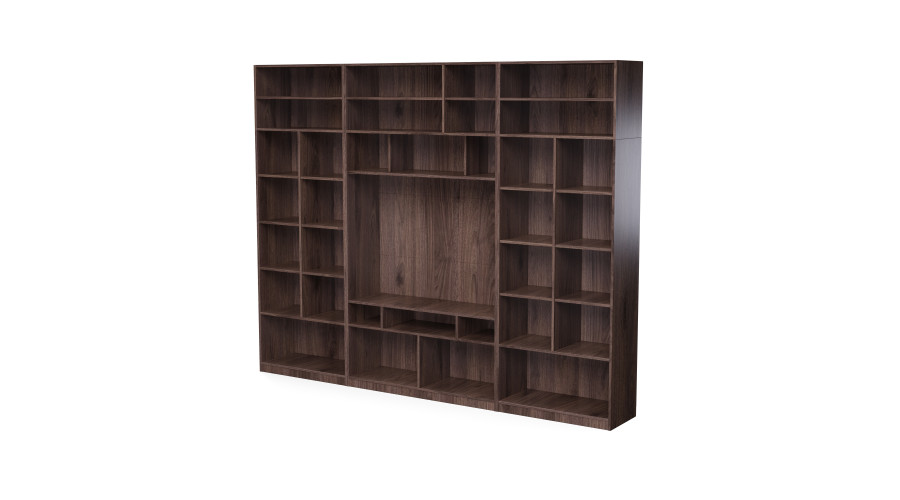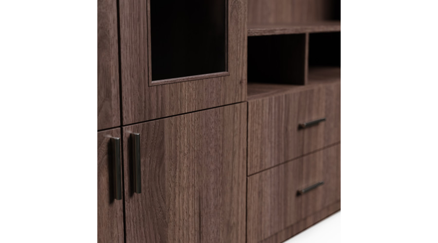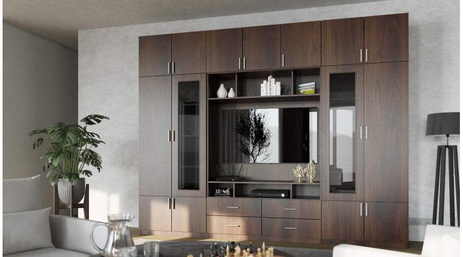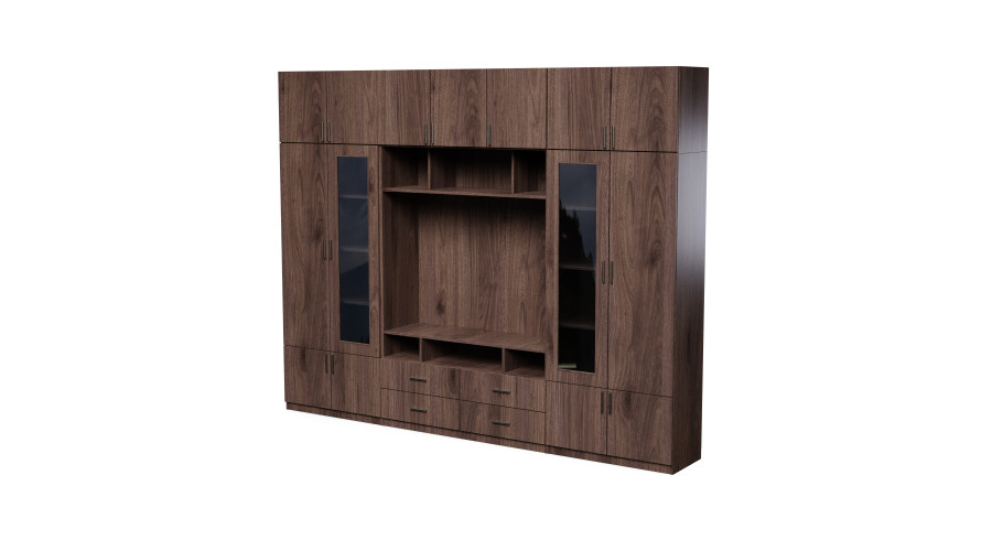 TV sieninė spintelė su stiklinėmis vitrinomis 303 × 240 cm, Orzech Okapi – VERO