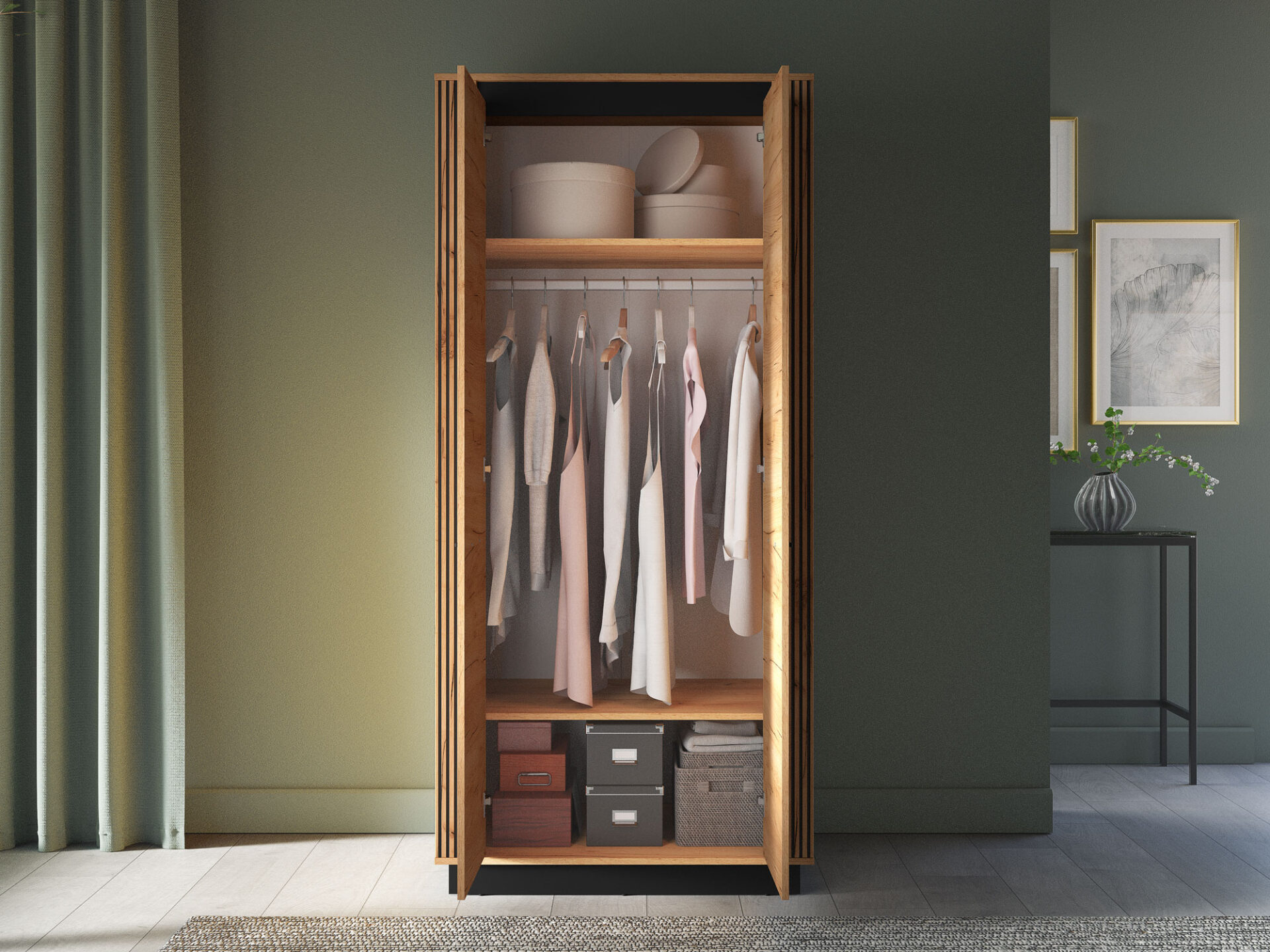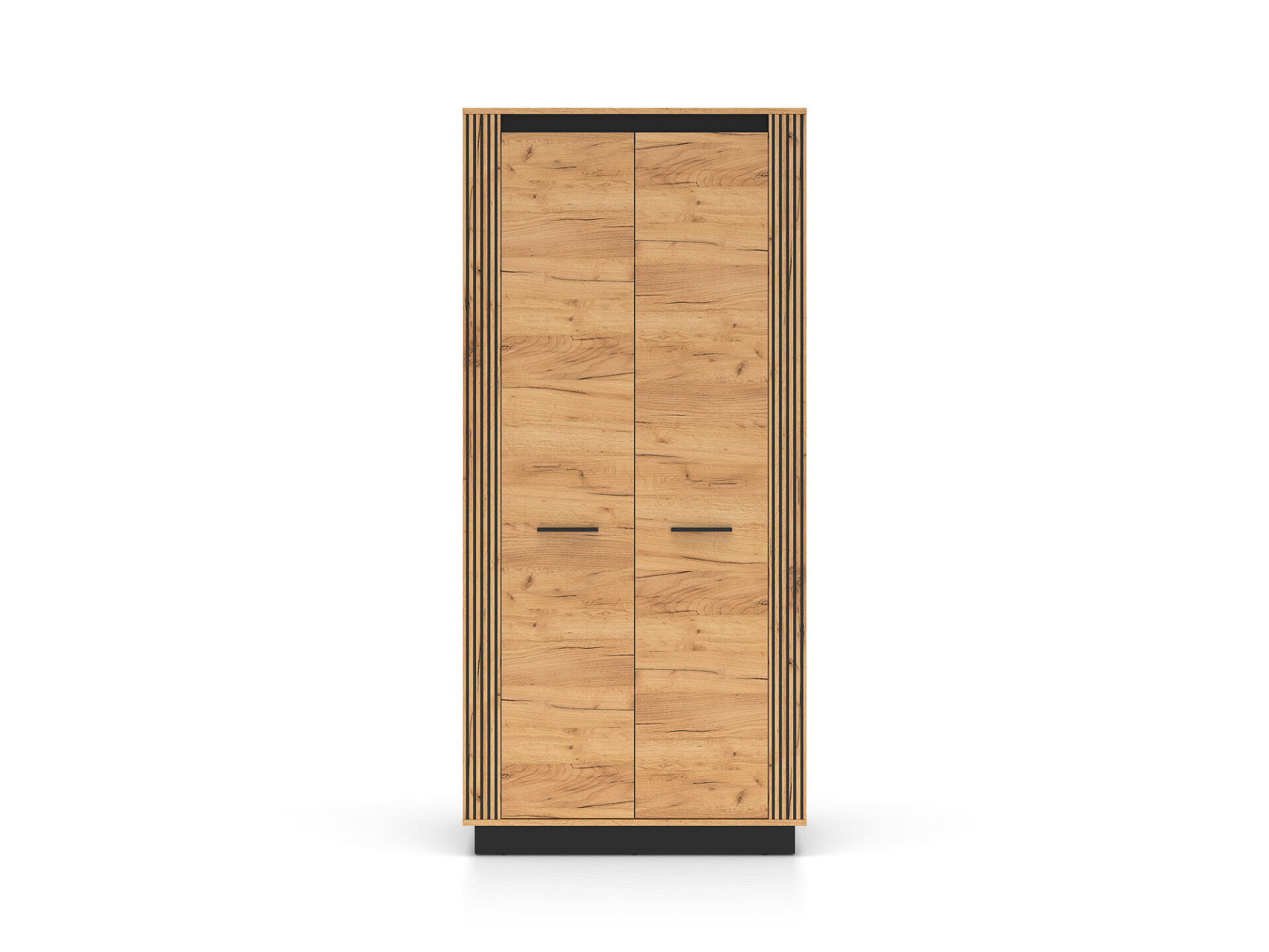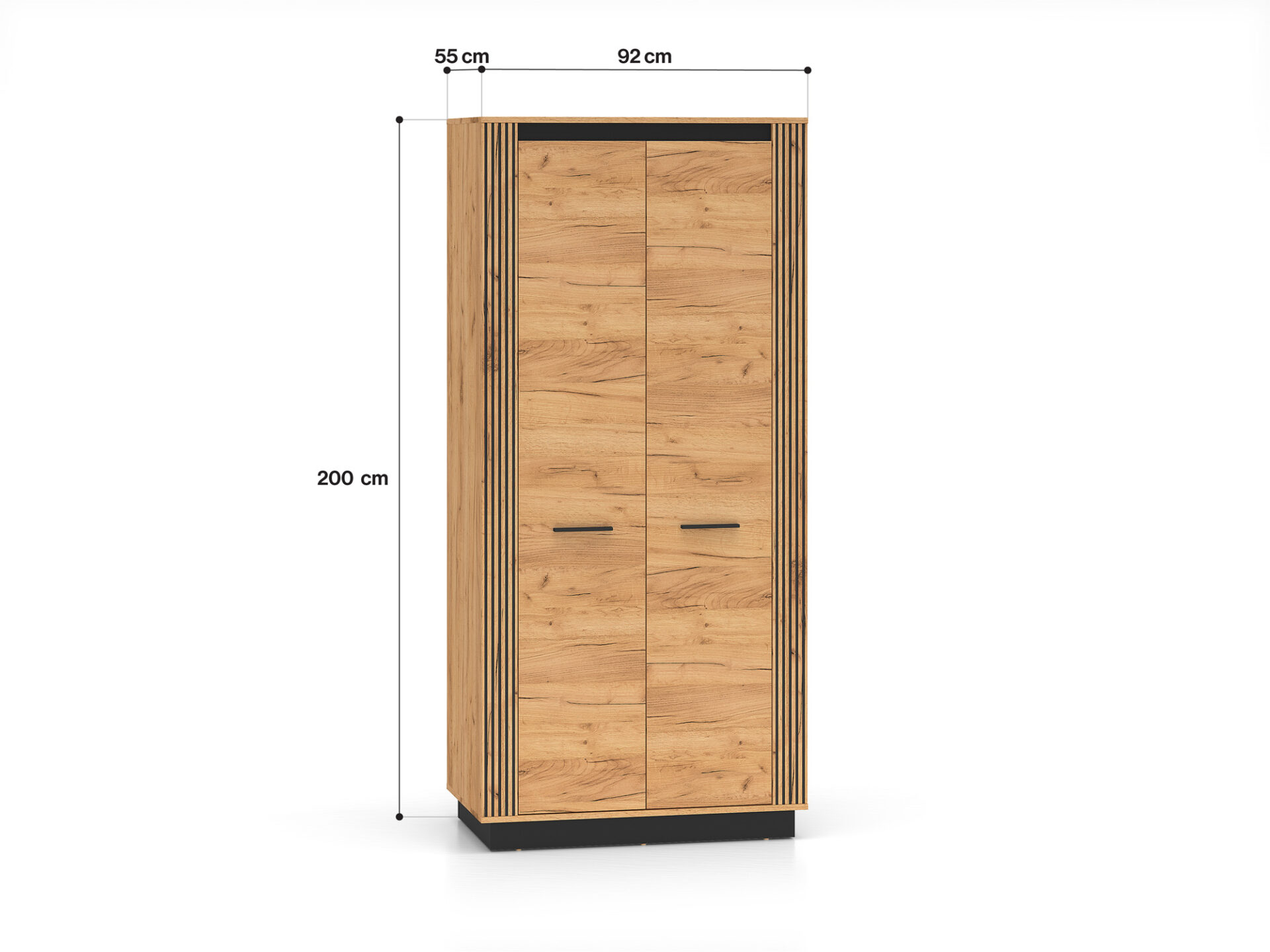 Dviejų durų „Urso 03“ spinta – puikus sprendimas drabužiams, aksesuarams ir kitiems namų tekstilės gaminiams laikyti. Tvirtas strypas, einantis per visą spintos plotį, leidžia pakabinti paltus, kostiumėlius ar sukneles. Didelė viršutinė ir apatinė lentynos taip pat leidžia susidėti patalynę ir rankšluosčius. „Urso 03“ dizainas derina klasikinį ąžuolo rašto stilių su moderniu juodų elementų pavidalu. Originalūs, frezuoti įdėklai pabrėžia unikalų visų „Urso“ kolekcijos gaminių charakterį.