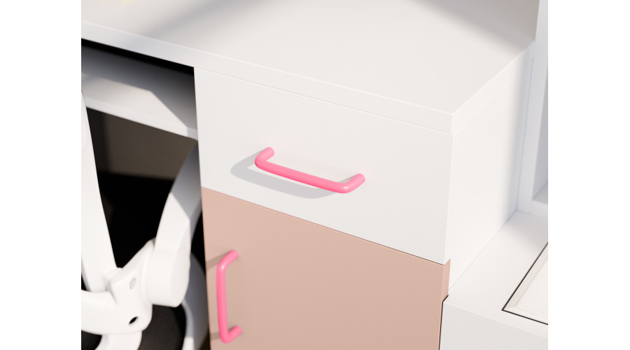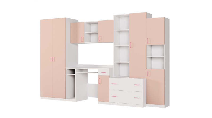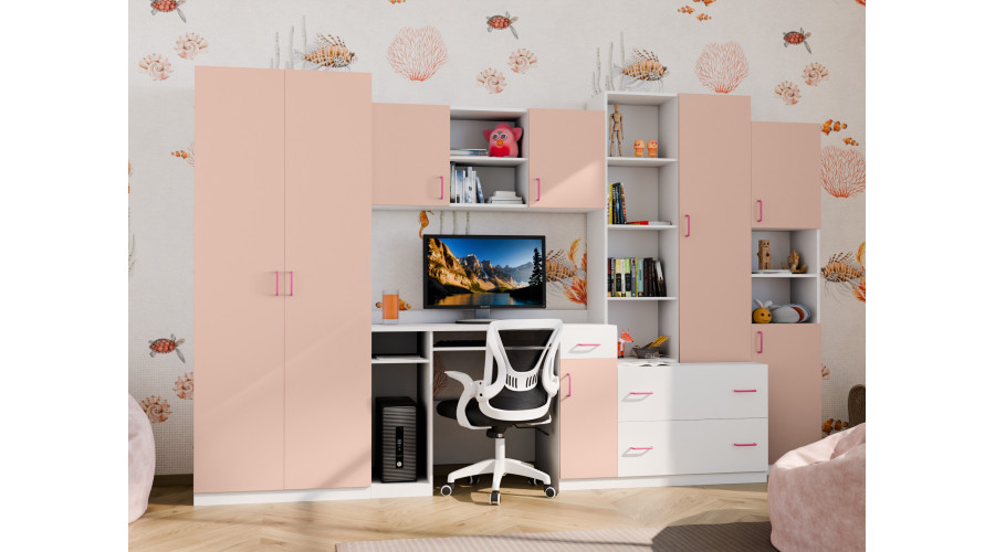 Ryškiai baltos ir švelniai rožinės spalvų derinys suteikia sieninei spintelei lengvumo ir draugiškumo, puikiai tinkančio vaikų ir paauglių interjerui. Ši spalvų gama leidžia komplektui tapti jaunimo sienine spintele tiek mergaičių, tiek jaunesnių paauglių kambariuose, sukuriant šviesią ir harmoningą erdvę.