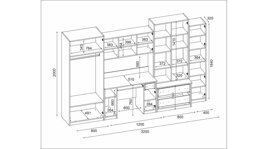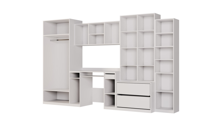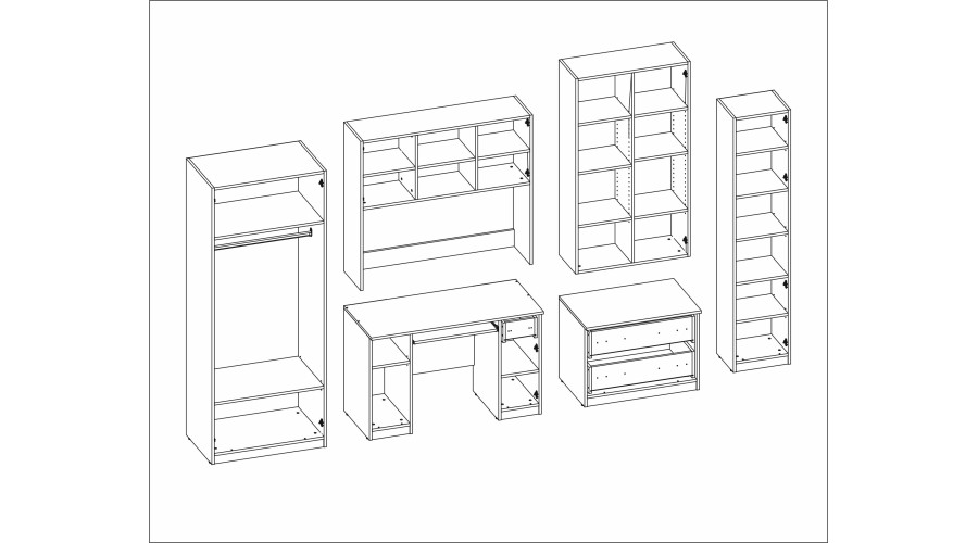 Komplektą sudaro erdvi spinta, rašomasis stalas su patogia darbo vieta ir papildomos lentynos bei spintelės, kurios palengvina knygų, sąsiuvinių, mokyklinių prekių ir asmeninių daiktų organizavimą. Stalas suteikia patogią vietą mokytis ir dirbti prie kompiuterio, o elementų išdėstymas skatina tvarką be pertekliaus įspūdžio.