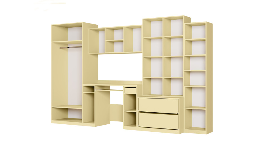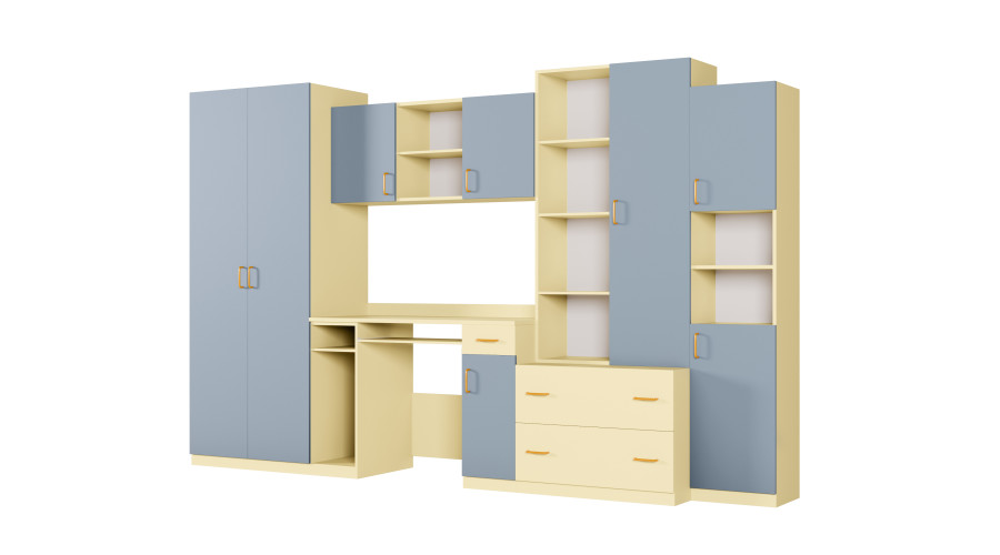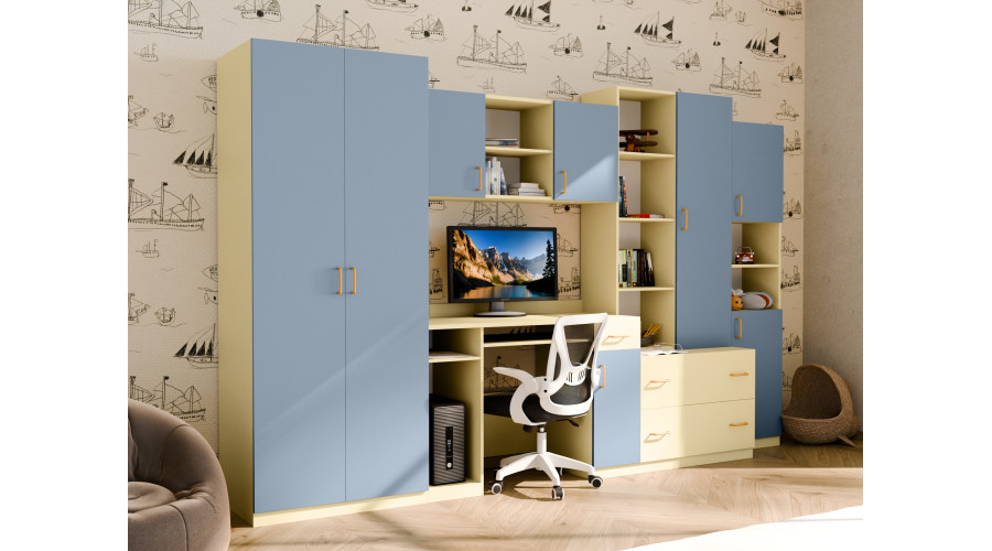 NEL variantas vanilės ir kreidos mėlynumo spalvų – tai jaunimo sieninė spintelė su spinta ir rašomuoju stalu, sukurta praktiškai ir tvarkingai išdėstyti vaiko ar paauglio kambarį. 320 x 200 cm dydžio spintelė sujungia darbo ir daiktų laikymo zonas vienoje darnioje struktūroje, puikiai tinkančioje kasdieniam naudojimui.