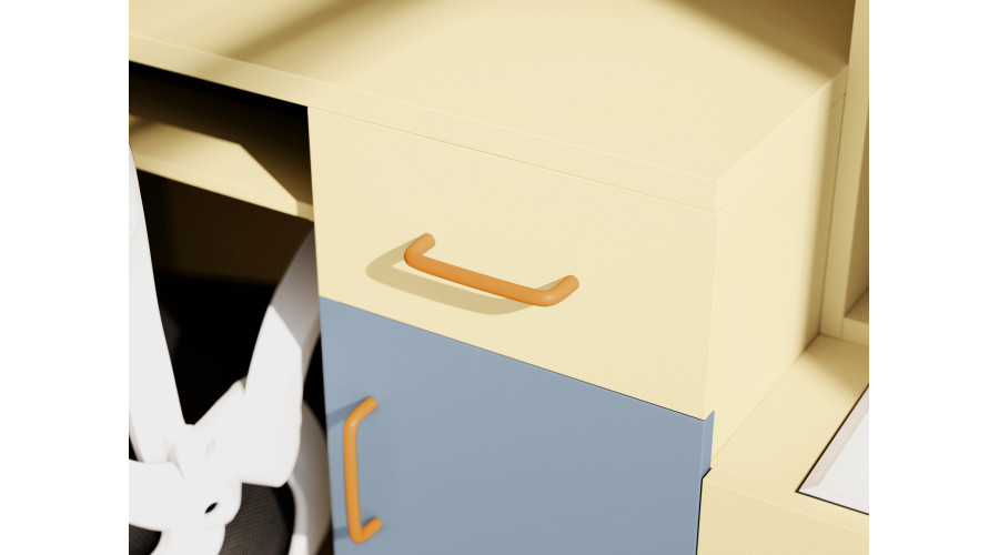 Komplektą sudaro erdvi spinta, stalas su patogia darbo vieta ir papildomos lentynos bei spintelės, kurios palengvina knygų, sąsiuvinių, mokyklinių prekių ir asmeninių daiktų organizavimą. Toks išdėstymas skatina susikaupimą mokantis ir leidžia palaikyti tvarką be dažno perstatymo.