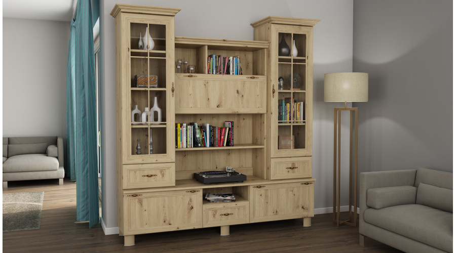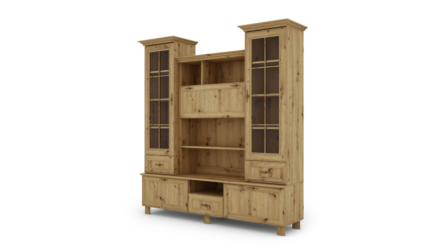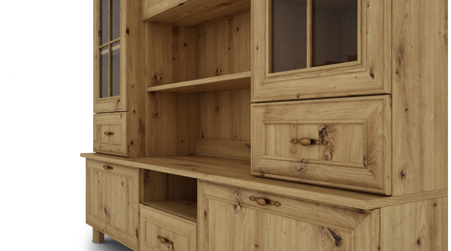 180 cm pločio „Navia“ – tai erdvi vitrina ant aukštų kojelių, sukurta kaip reprezentacinis svetainės arba valgomojo elementas. Platus, segmentuotas dizainas sujungia įstiklintą plotą su knygų lentynomis ir uždaru baru, sukurdamas funkcionalų ir tvarkingą išdėstymą.