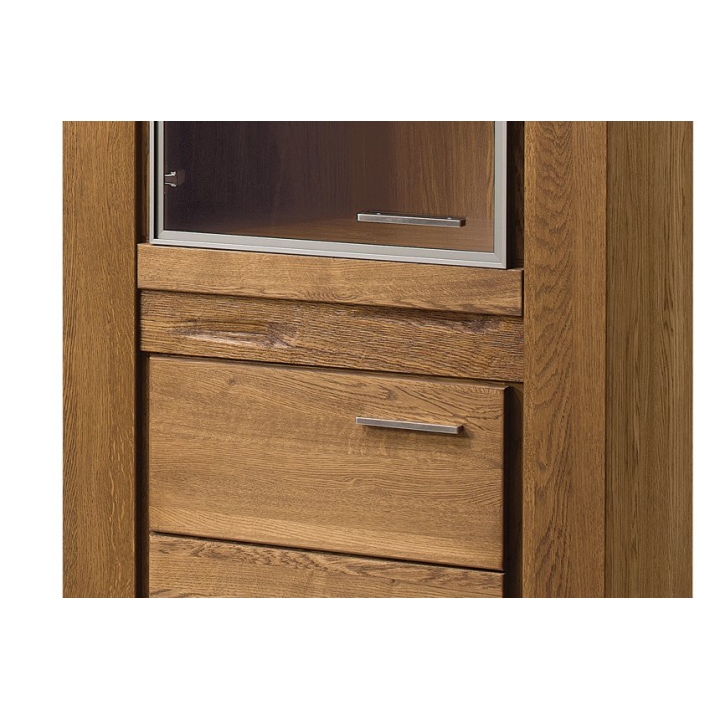 „Szynaka Meble“ aksominė 2 durelių kairioji vitrina „Type 10“ derina klasikinį dizainą su precizišku meistriškumu. Priekinė dalis pagaminta iš tvirtos ąžuolo medienos, o korpusas – iš natūralaus ąžuolo faneruotės, „Rustikal Oak“ spalvos, todėl ši vitrina tikrai traukia akį. Tvirta apdaila ir šlifuotas paviršius suteikia jai unikalų charakterį. Stiklinė dalis leidžia eksponuoti dekoratyvinius stalo įrankius, šeimos relikvijas ar dekoracijas, o švelniai užsidarančios durelės leidžia tvarkingai laikyti daiktus. Šis modelis aprūpintas šampano spalvos metalinėmis rankenomis, kurios puikiai papildo natūralią medienos spalvą ir pabrėžia jos kaimišką charakterį. Vitrina pristatoma pilnai surinkta, todėl nereikia papildomo surinkimo. Standartiškai gaminį papildo dekoratyvinis, apšviestas, perforuotas elementas. Tiems, kurie ieško papildomų akcentų, galima užsisakyti LED apšvietimą, kuris paryškintų stiklinės dalies turinį – išsamesnės informacijos teiraukitės savo konsultanto.