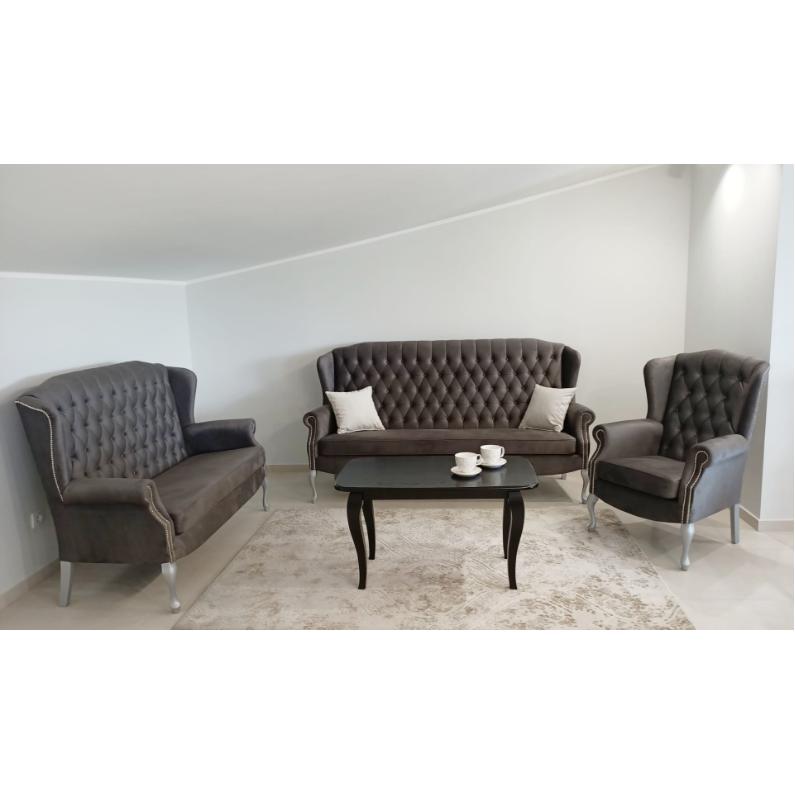 „Ludwig“ komplektas – unikalus baldas ieškantiems Liudviko stiliaus baldų. Lengvumas ir grakštumas – tai unikalūs privalumai. Formuotos atlošo juostelės ir patogūs porankiai suteikia išskirtinį komfortą. Specifikacijos: - Labai elastingi dirželiai, - Labai atsparus HR putplastis, - Dygsniavimas, - Sidabriniai dekoratyviniai blizgučiai, - Sidabrinės medinės kojelės.