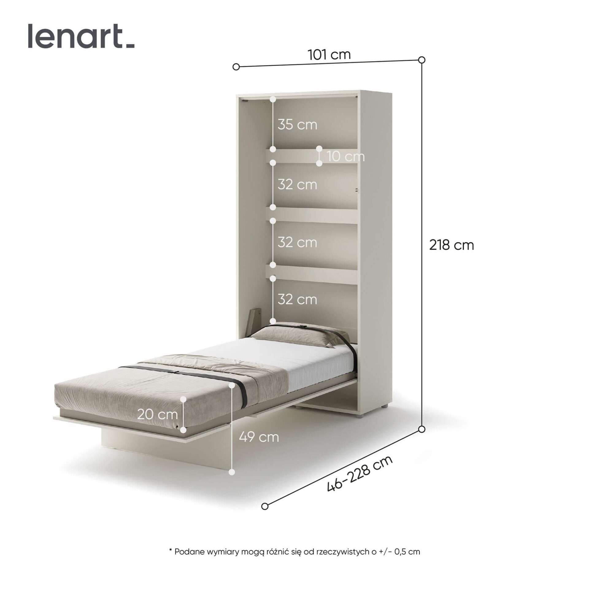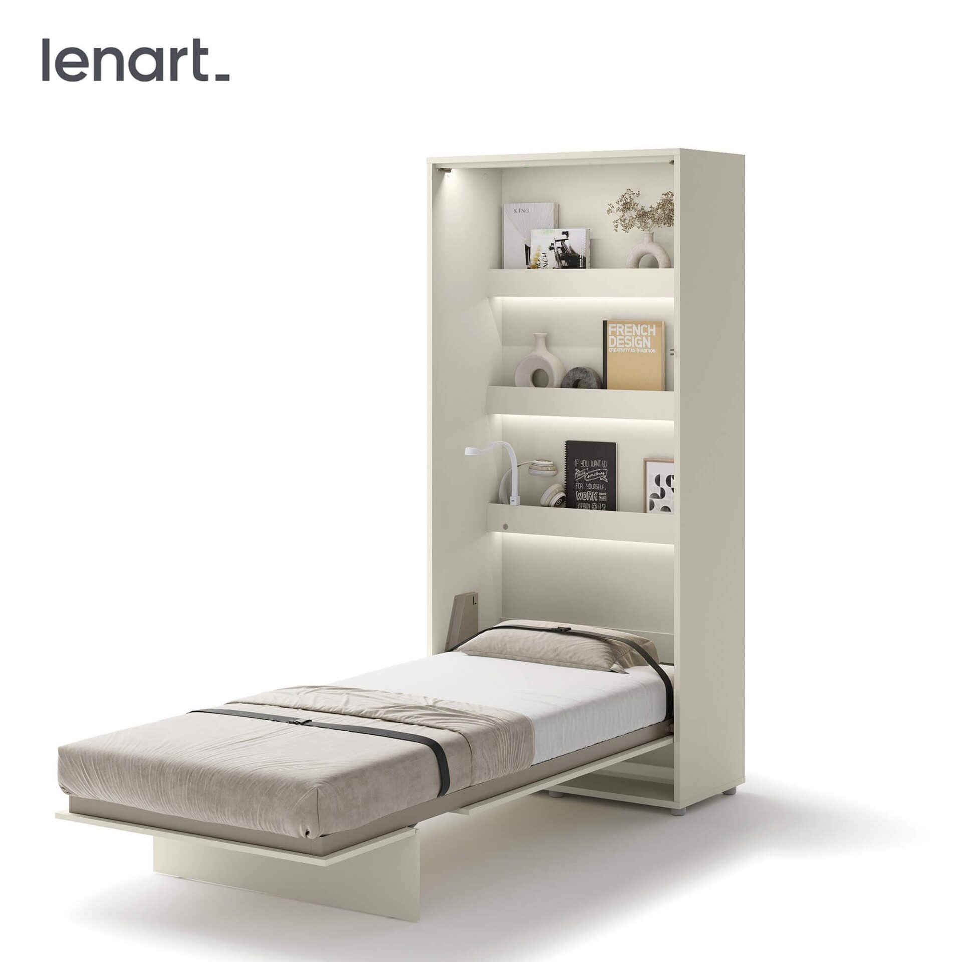 Вертикальная откидная кровать Lenart BED CONCEPT BC-03 шириной 90 см — это практичная откидная кровать, позволяющая удобно обустроить даже самое маленькое помещение. Lenart создала решение, которое за считанные минуты превратит вашу гостиную в уютную спальню. Версия цвета кашемир выглядит элегантно и современно, но при этом дополняет различные интерьеры. Модель BED CONCEPT BC-03 рассчитана на матрас шириной 90 см, что делает ее идеальной кроватью для одного человека, ребенка постарше или подростка. Дополнительные полки внутри идеально подходят для хранения книг, декоративных предметов или предметов первой необходимости. Прочная конструкция, металлический каркас и пневматические подъемники гарантируют устойчивость и безопасность. За инновации и качество изготовления откидная кровать была удостоена Золотой медали на Познаньской международной выставке 2019 года. Благодаря своей универсальной форме и теплому цвету кашемир, откидная кровать дополняет как современные, так и классические интерьеры. Этот предмет мебели позволяет максимально эффективно использовать пространство и обеспечивает комфортный ночной сон.