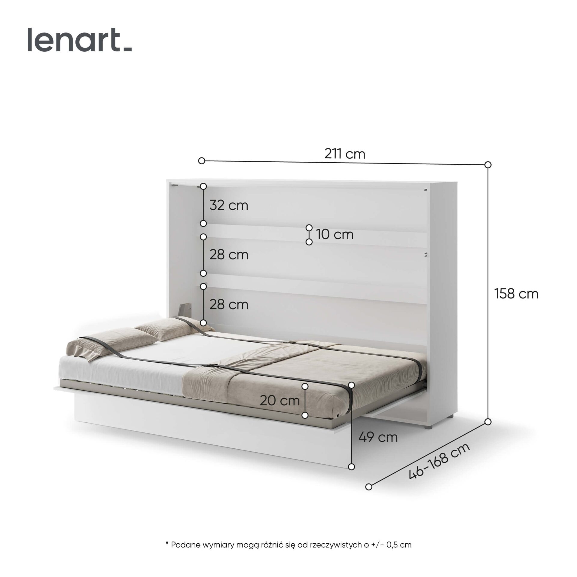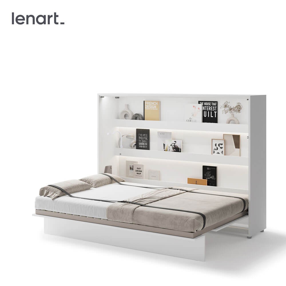 Горизонтальная откидная кровать Lenart BED CONCEPT BC-04 шириной 140 см — это современная откидная кровать, идеально подходящая для небольших и средних квартир. Компания Lenart разработала предмет мебели, который позволяет в считанные минуты превратить вашу гостиную в уютную спальню. Белый вариант отличается элегантным и вневременным дизайном, что делает его подходящим для различных стилей интерьера. Модель BED CONCEPT BC-04 рассчитана на матрас шириной 140 см, что делает ее идеальным выбором в качестве кровати для пары или просторного спального места для одного человека. Практичные полки внутри позволяют хранить книги, предметы декора и повседневные вещи. Прочная конструкция, металлический каркас и пневматические подъемники обеспечивают комфорт и безопасность, а за инновации и качество изготовления изделие было удостоено Золотой медали на Познаньской международной выставке 2019 года. Это решение сочетает в себе функциональность, компактность и современный дизайн. Оно идеально подходит как для повседневного использования, так и для гостевой комнаты, обеспечивая комфортный ночной сон и гибкую организацию пространства.