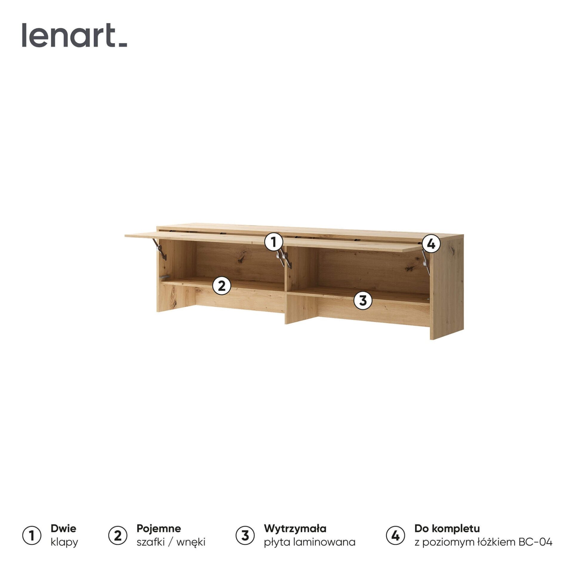 Кровать Lenart BED CONCEPT BC-09 — это пристройка к откидной кровати BC-04 в цвете Artisan Oak, позволяющая максимально эффективно использовать пространство и создать практичное и современное решение для спальни. Оснащенная двумя откидными секциями и двумя открытыми нишами, она идеально дополнит кровать из коллекции BED CONCEPT. Lenart BED CONCEPT BC-09 в цвете Artisan Oak сочетает в себе функциональность и элегантную, теплую отделку, придавая интерьеру уютную атмосферу. Просторные отделения, скрытые за фасадами, позволяют хранить самые разные вещи — от одежды и текстиля до аксессуаров и предметов повседневного обихода. Открытая секция с нишами идеально подходит для книг, декоративных элементов или сувениров, улучшая общую эстетику. Эта пристройка делает откидную кровать еще более практичной и создает ощущение полноценного, функционального комплекта мебели для спальни. Изготовленная из высококачественной ламинированной плиты и отделанная кромкой из ABS-пластика, она гарантирует долговечность и устойчивость к повседневному использованию. Натуральная отделка Artisan Oak делает эту кровать идеальным дополнением как к современным, так и к классическим интерьерам.
