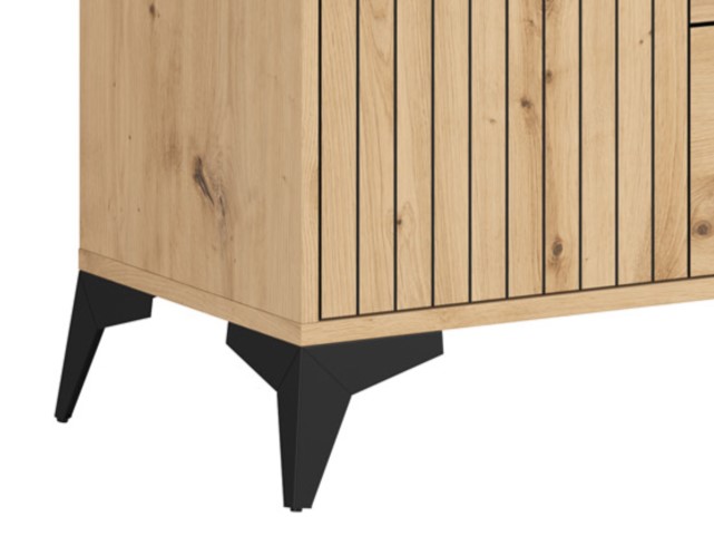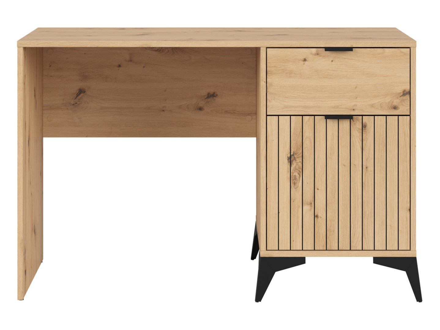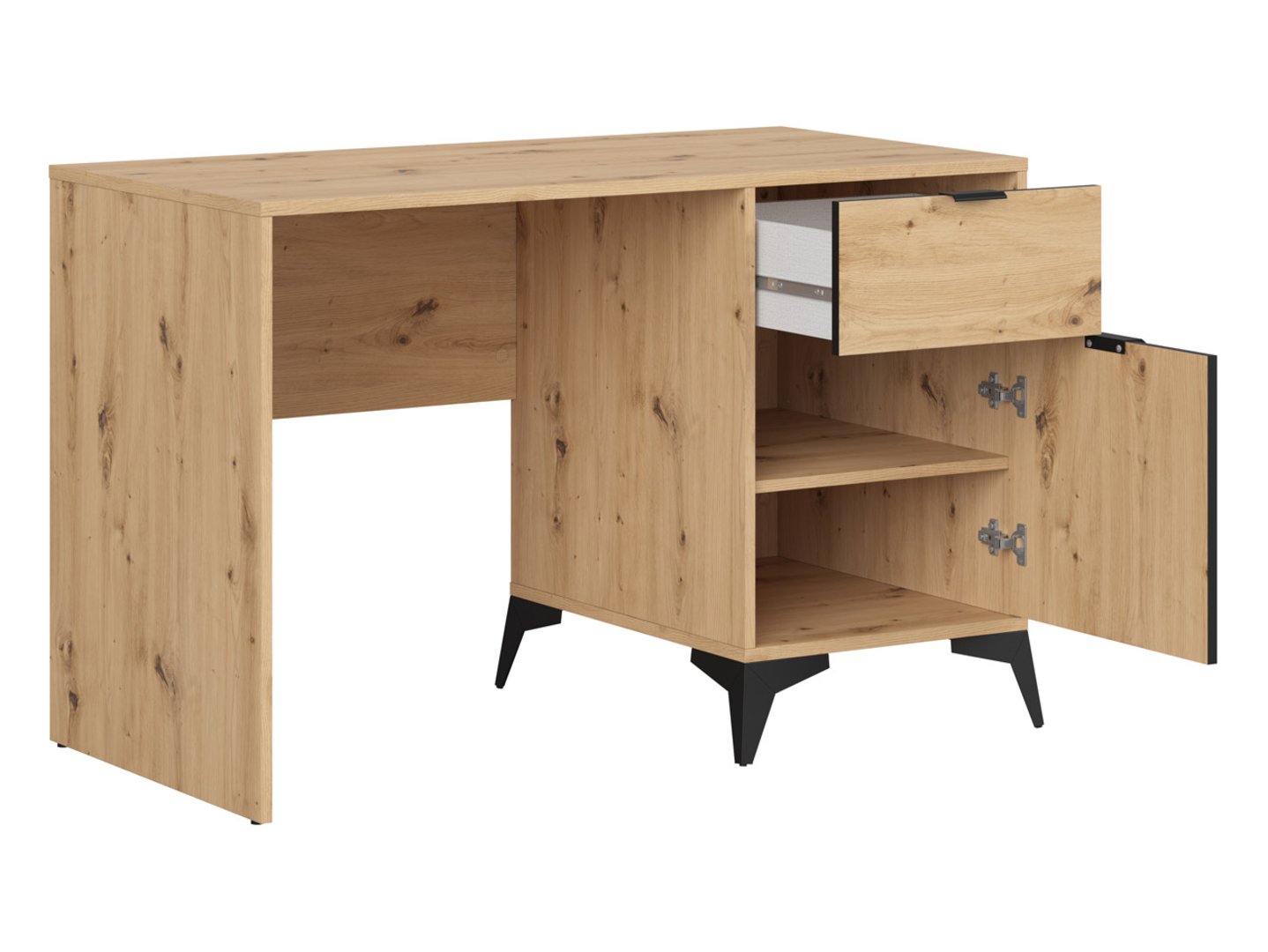 Письменный стол Lamea – работа в гармонии с природой. Коллекция Lamea сочетает в себе функциональность и эстетику, вдохновленную природой. Благодаря своей универсальности, он подходит как для строгих лофтов, так и для уютных интерьеров в стиле бохо. Прочный ламинат, из которого изготовлена мебель, обеспечивает ее долговечность. Письменный стол Lamea с дверцами и ящиком идеально подходит как для домашнего офиса, так и для рабочего места в гостиной или спальне. Столешница размером 120 x 60 см предлагает достаточно места для ноутбука и документов, а также служит отличным местом для учебы, работы за компьютером или различных творческих проектов. Практичный ящик и две полки за дверцей позволяют хранить офисные и художественные принадлежности. Передняя часть стола украшена вертикальными фрезерными элементами, покрытыми черным лаком, что придает ей трехмерный эффект. Эти тщательно выполненные канавки, имитирующие планки, являются одним из последних трендов в дизайне интерьера, добавляя мебели современный характер. Столешница, изготовленная из устойчивого к царапинам ламината, долгое время сохраняет эстетическую привлекательность даже при ежедневном использовании. Теплый оттенок дуба ручной работы идеально дополняет черные элементы, такие как ручки и наклонные ножки, создавая современное и выразительное целое. Письменный стол Lamea лучше всего смотрится в сочетании с другой мебелью из этой коллекции, создавая функциональный и гармоничный интерьер.