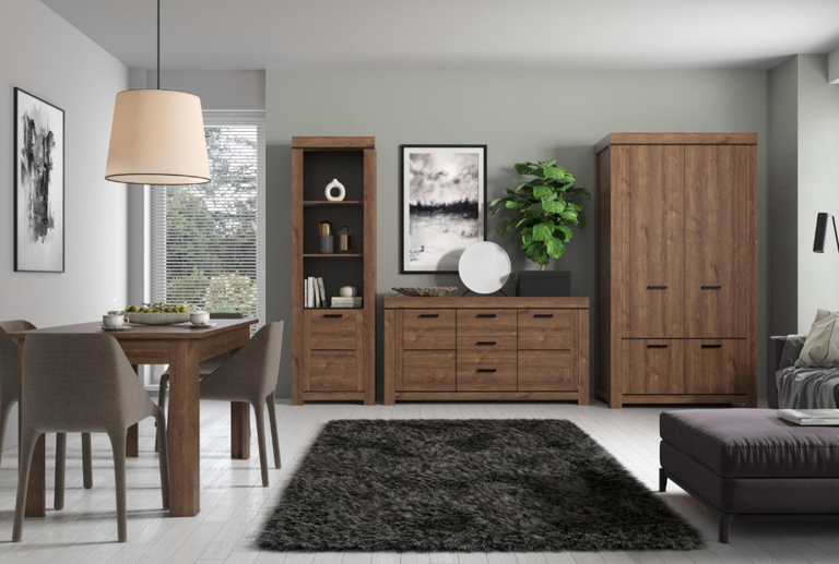 В коллекцию входят витрины, стеллажи, раздвижной стол, журнальный столик, подставка под телевизор и шкаф для одежды.