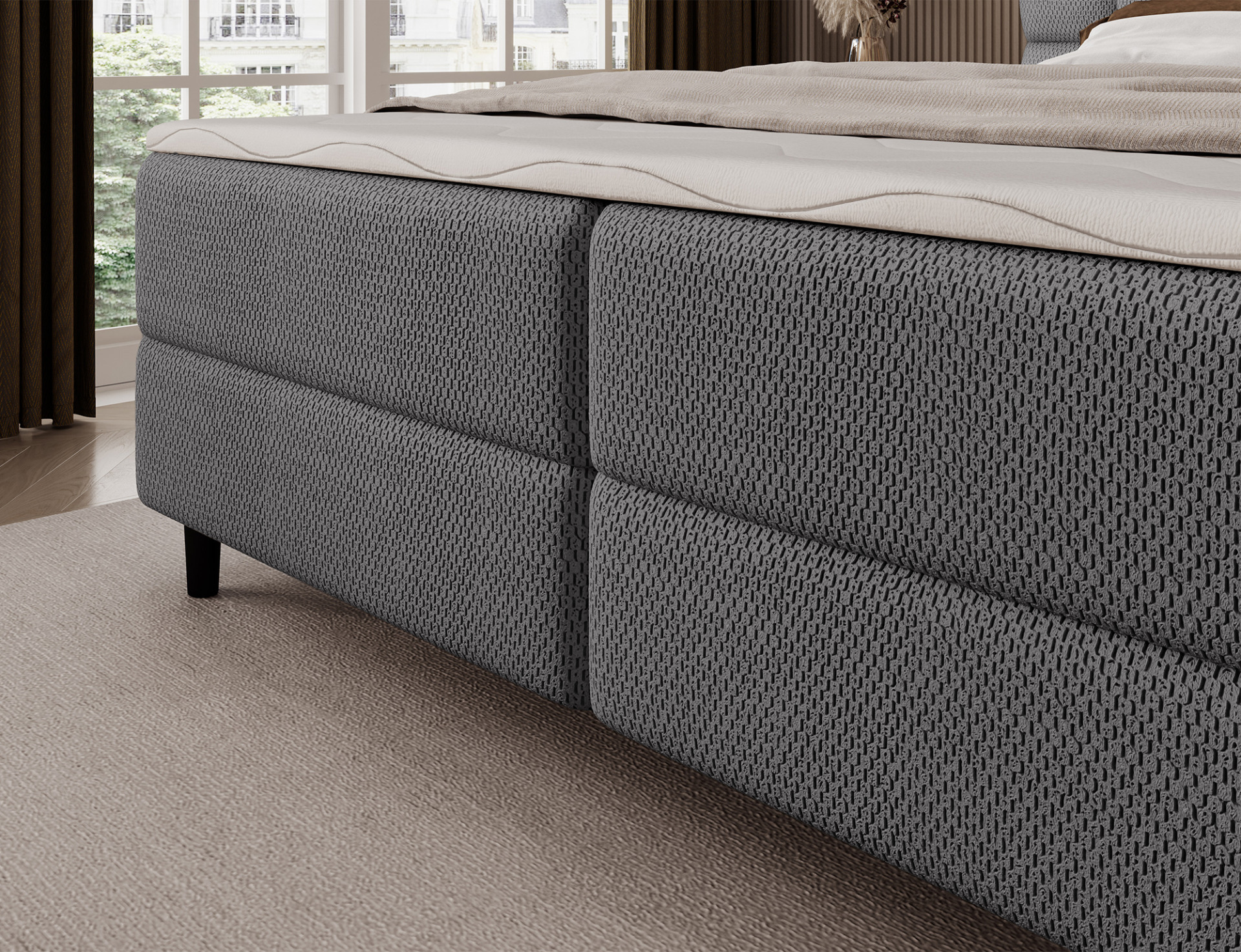 Континентальная кровать Camma – это сочетание современного дизайна, функциональности и комфорта для сна, идеально подходящее для элегантной и практичной спальни; она доступна в трех размерах: 140×200 см, 160×200 см и 180×200 см, что позволяет идеально подобрать размер в соответствии с пространством и потребностями пользователя, а прочная конструкция общей высотой 102 см и высотой сиденья 56 см обеспечивает комфорт при ежедневном использовании; глубина кровати составляет 222 см, а ширина зависит от выбранной модели и составляет 162 см, 182 см или 202 см соответственно, что придает кровати устойчивый и солидный вид, подчеркивая престижный характер интерьера; обивка выполнена из высококачественной ткани с приятной на ощупь текстурой, а эстетичное изголовье с впечатляющей стежкой добавляет современной элегантности и создает идеальную опору для вечернего отдыха. Практичный контейнер для постельного белья позволяет поддерживать порядок в спальне и оптимально использовать пространство, делая кровать Camma не только удобной, но и чрезвычайно функциональной; всю конструкцию дополняют черные деревянные ножки высотой 10 см, которые придают конструкции легкость и облегчают уборку под кроватью; модель Camma — идеальное предложение для людей, ценящих современный стиль, элегантность, долговечность и комфорт, обеспечивающие здоровый и спокойный сон каждый день.