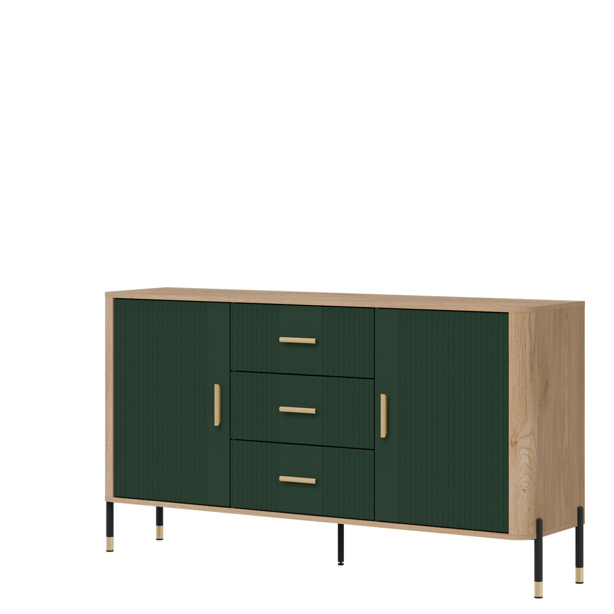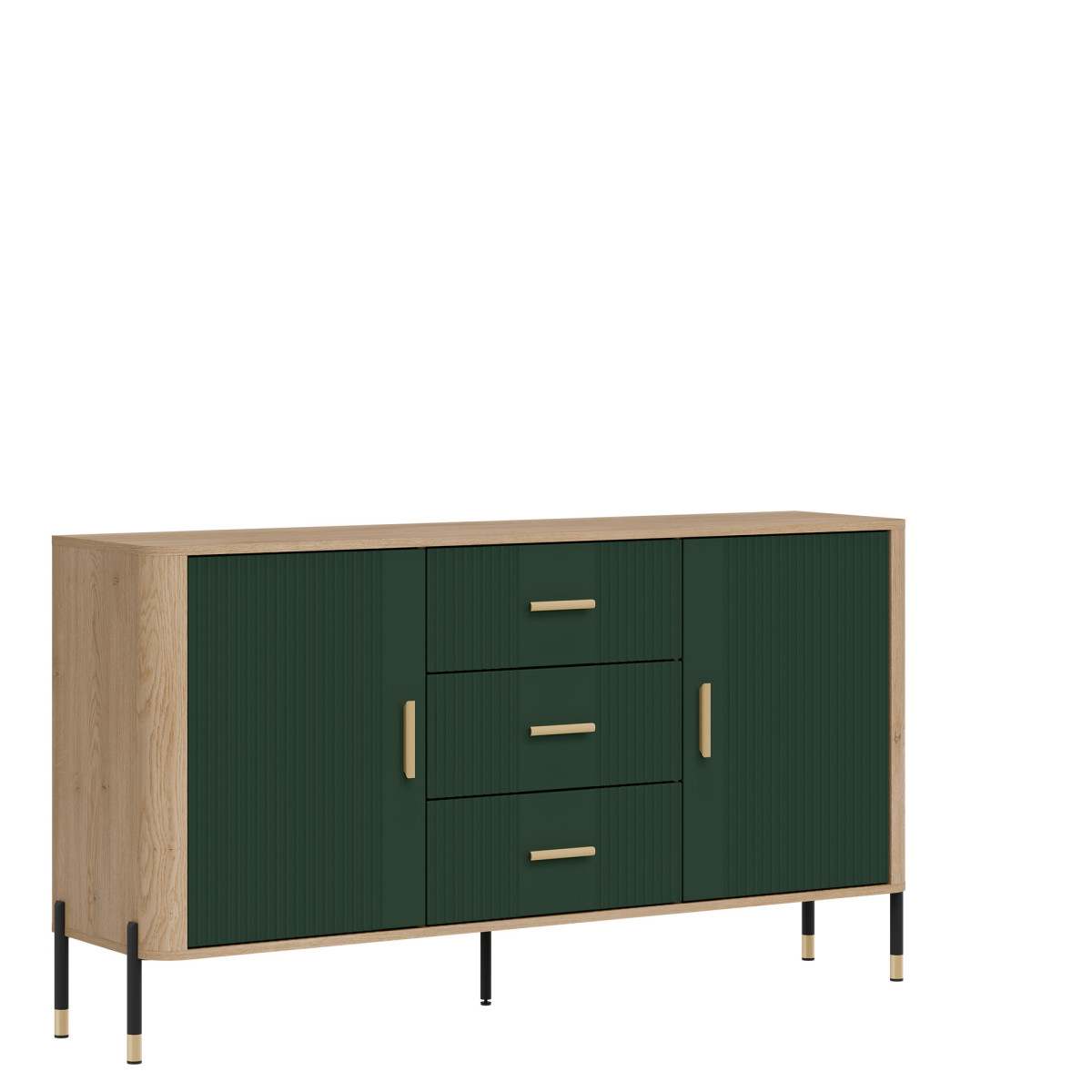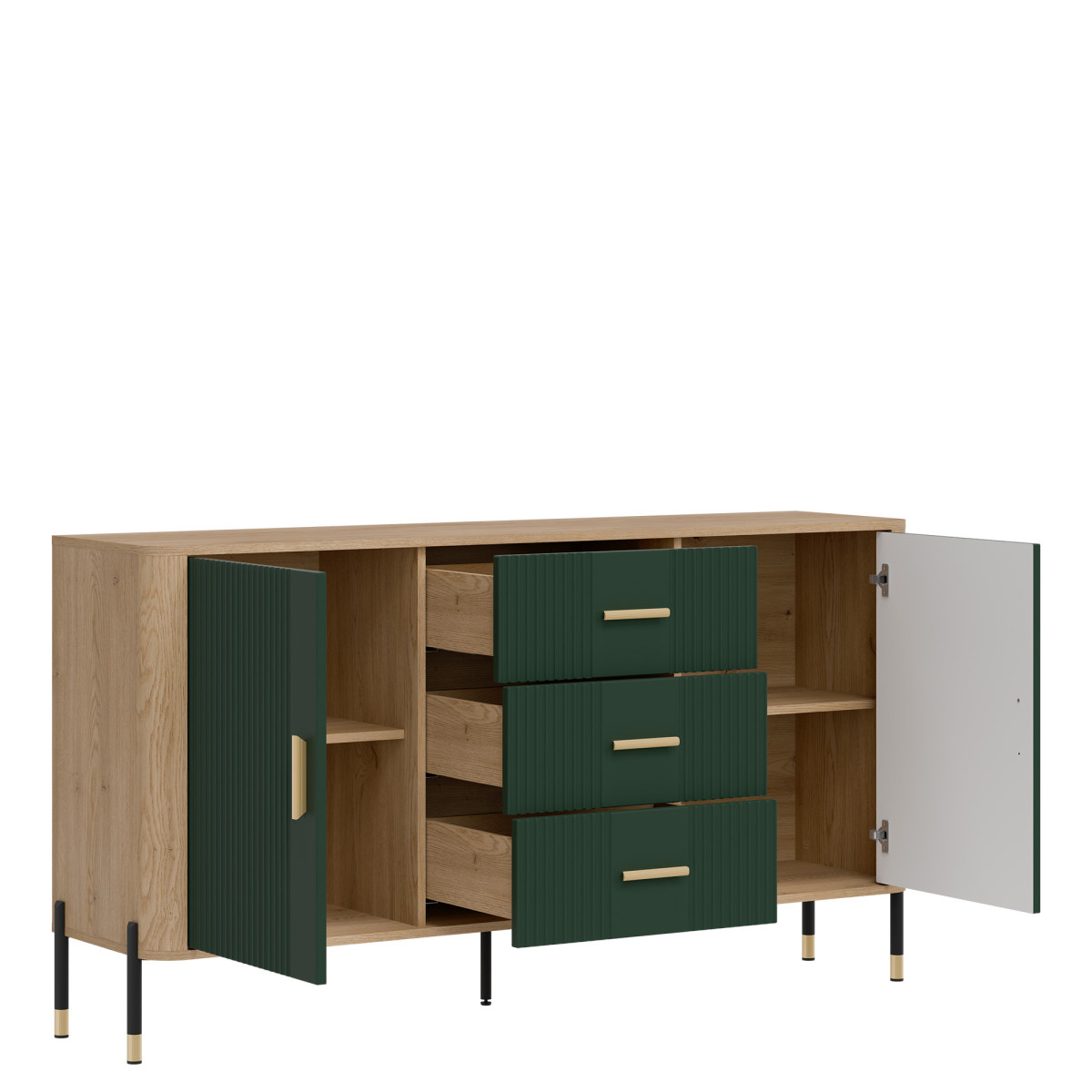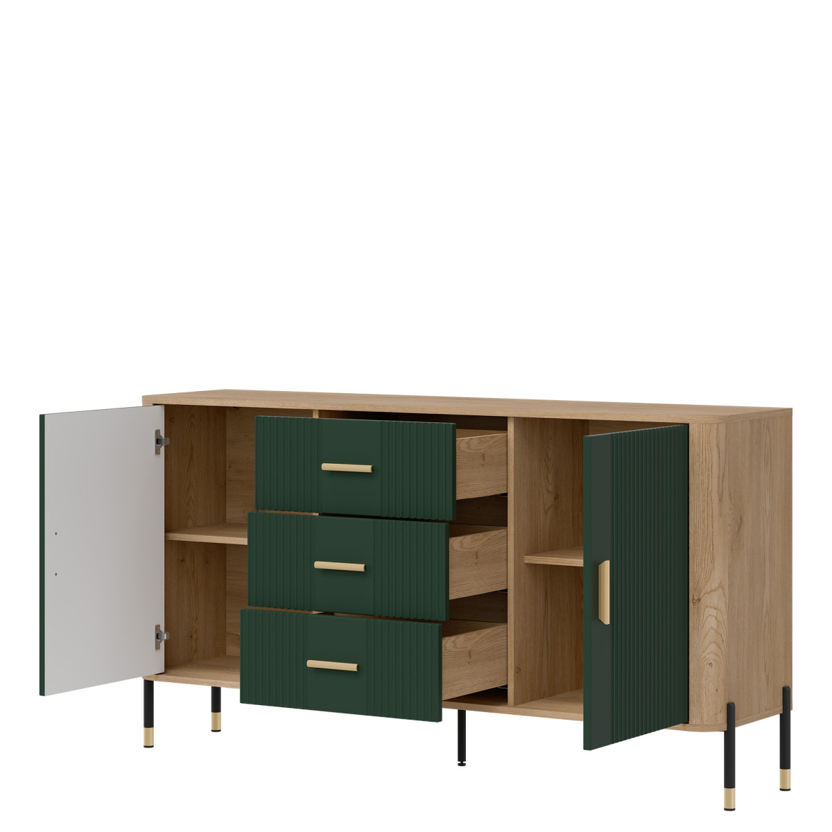 Ширина 164,5 см, глубина 40 см, высота 88 см, вес изделия с упаковкой 58,45 кг. Код/символ производителя DT06. Название коллекции DANTE. Название в системе b2b: DANTE DT06 CREMONA OAK T/MATT GREEN CHEST OF DRAWERS SET. Количество упаковок: 5. Стиль: Модерн. Комплектация: Инструкция по сборке / аксессуары для сборки. Сборка: Самостоятельная сборка. Цвет корпуса: Cremona Torro Oak. Материал/тип/толщина корпуса: ДСП 16 мм / Плита МДФ 32 мм. Материал/тип/толщина верхней части корпуса: ДСП 16 мм. Материал/тип/толщина нижней части корпуса: ДСП 16 мм. Цвет полок: Cremona Torro Oak. Материал/тип/толщина полок: ДСП 16 мм. Количество полок: 2. Материал/тип/толщина задней стенки: ДСП HDF 2,5 мм. Видимая часть задней стенки: Цвет: Artisan Oak. Фасад: Матовый зеленый. Фасад: Материал/тип/толщина: МДФ 18 мм. Передняя петля мебельной панели: ⌀ 35 мм, регулируемая в трех плоскостях. Передняя ручка: Отделка / Цвет: Металл / Черный или Золотой. Система плавного закрывания дверей: Стандартная. Система плавного закрывания ящиков: Стандартная. Направляющие ящиков: Favorit Q2. Ножка / Цвет: Нерегулируемая / Металл / Черный – Золотой. Высота ножки: 118 мм. Дополнительная ножка / Цвет: Регулируемая средняя / Металл / Черный. Количество дверей: 2. Количество ящиков: 3. Количество закрытых ниш: 4.