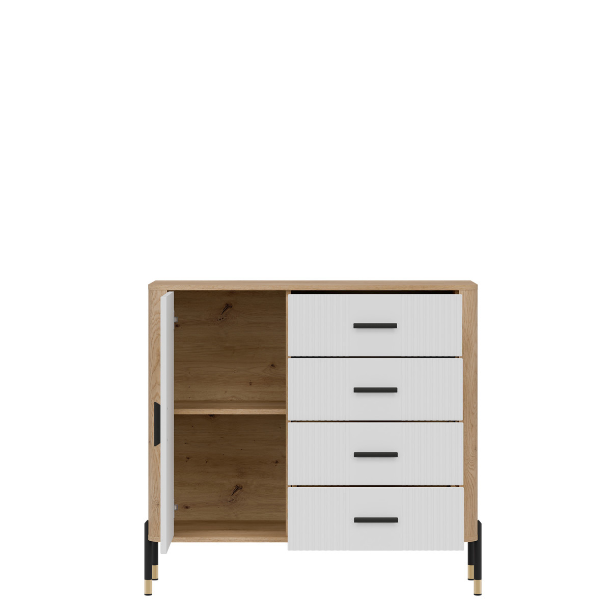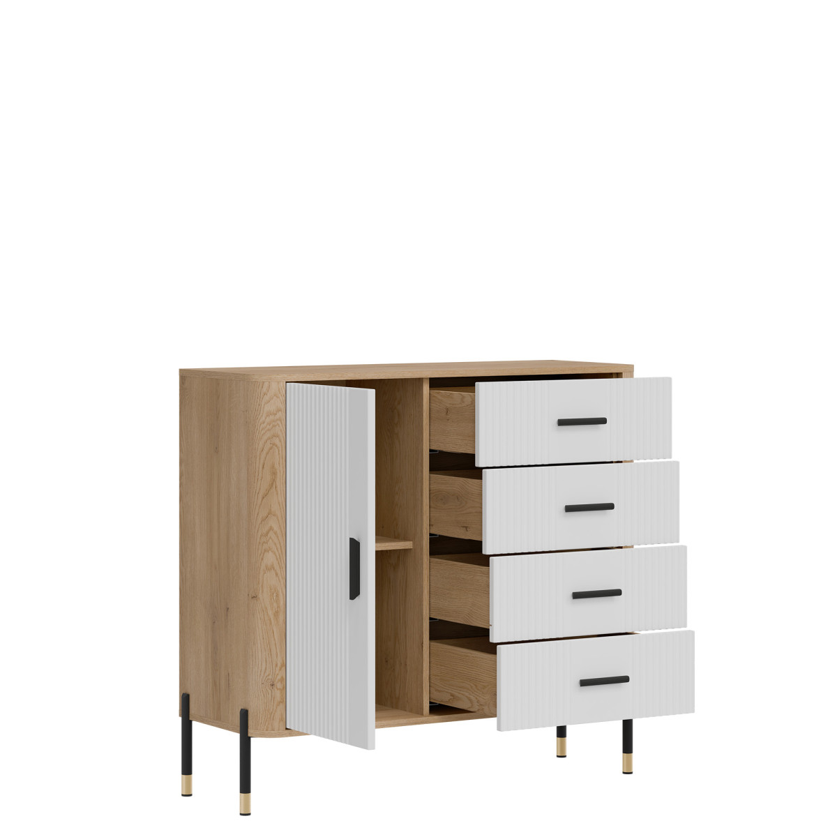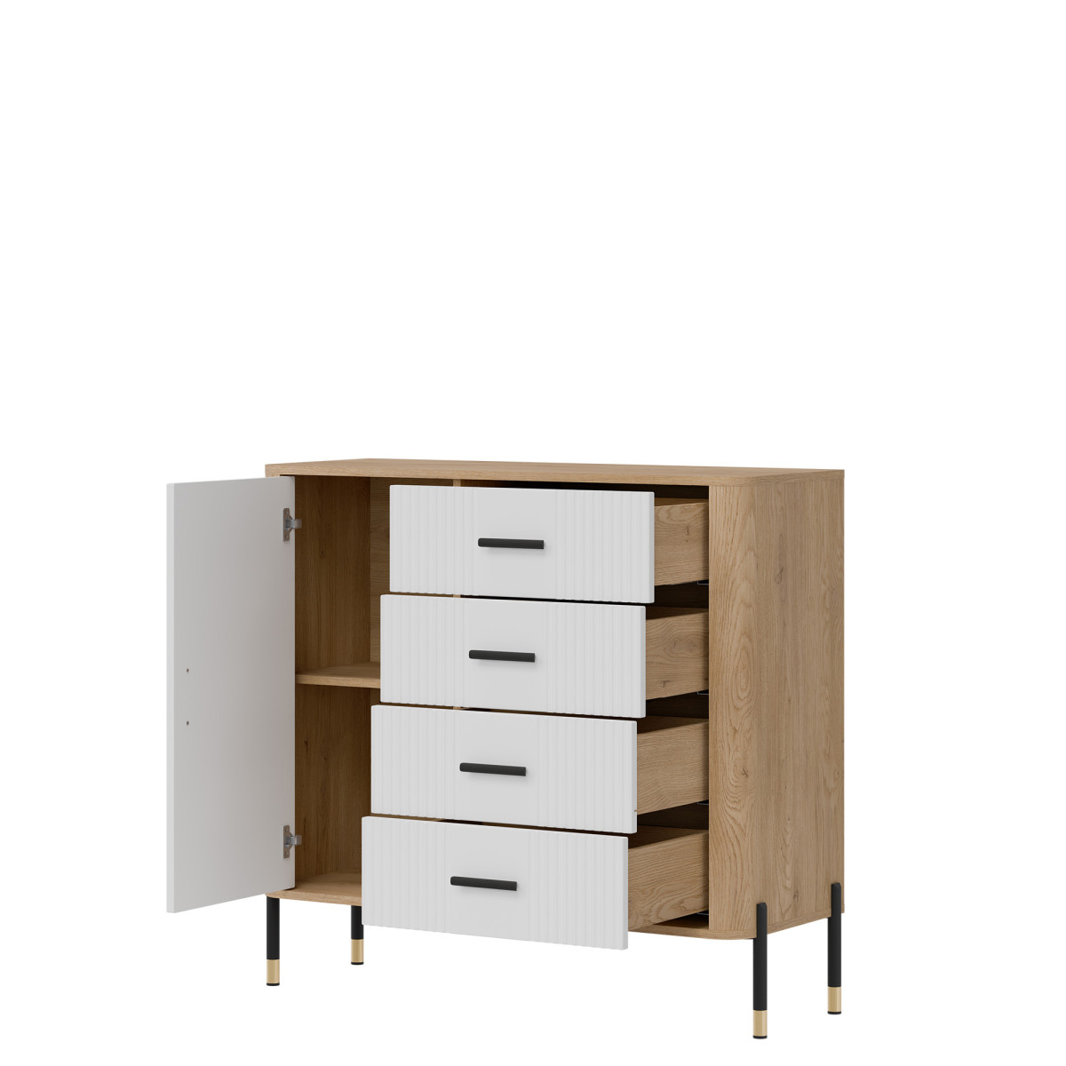Ширина 108,5 см, глубина 40 см, высота 100 см, вес изделия с упаковкой 50,00 кг. Код/символ производителя DT08. Название коллекции DANTE. Название в системе b2b: DANTE DT08 CREMONA OAK T/MATT WHITE CHEST OF DRAWERS SET. Количество упаковок: 5. Стиль: Модерн. Комплектация: Инструкция по сборке / аксессуары для сборки. Сборка: Самостоятельная сборка. Цвет корпуса: Cremona Torro Oak. Материал/тип/толщина корпуса: ДСП 16 мм / Плита МДФ 32 мм. Материал/тип/толщина столешницы: ДСП 16 мм. Материал/тип/толщина столешницы: ДСП 2,5 мм. Цвет полок: Cremona Torro Oak. Материал/тип/толщина полок: ДСП 16 мм. Количество полок: 1. Материал/тип/толщина задней стенки: ДСП HDF 2,5 мм. Видимая часть задней стенки: Цвет: Artisan Oak. Цвет фасада: Матовый белый. Отделка фасада: материал/тип/толщина: Мебельная плита МДФ 18 мм. Передняя петля: ⌀ 35 мм, регулируемая в трех плоскостях. Передняя ручка / отделка / цвет: Металл / Черный или золотой. Система плавного закрывания дверей: Стандартная. Система плавного закрывания ящиков: Стандартная. Направляющие для ящиков: Favorit Q2. Ножка / отделка / цвет: Нерегулируемая / металл / черный – золотой. Высота ножки: 118 мм. Количество дверей: 1. Количество ящиков: 4. Количество закрытых ниш: 2.