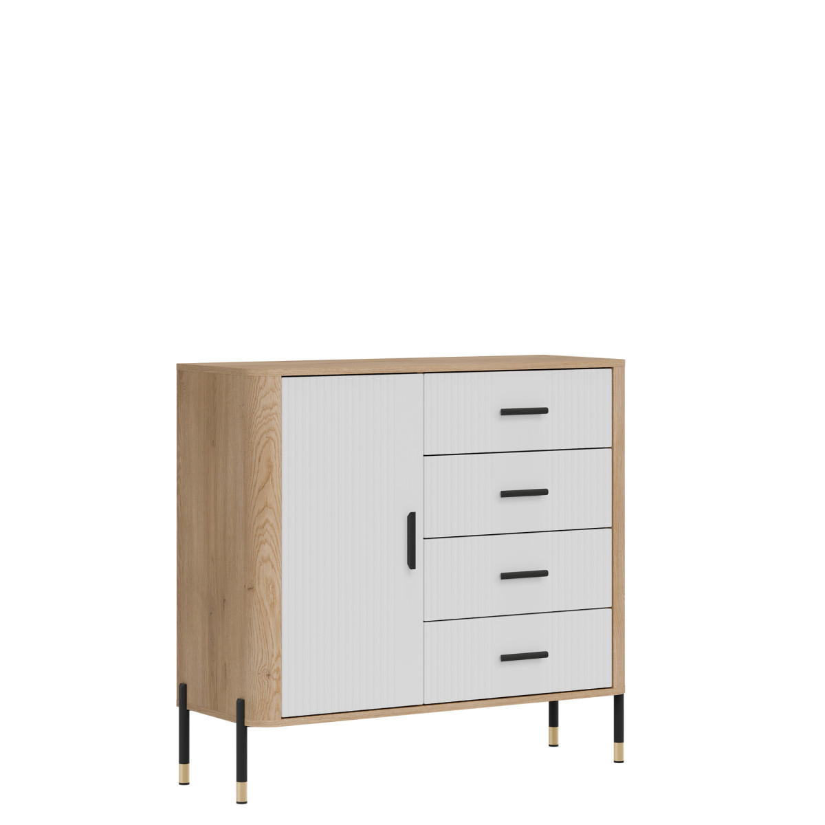 Комод Dante DT08 – компактный дизайн с элегантным акцентом. Этот стильный комод сочетает в себе современную эстетику и высокую функциональность, идеально подходящий как для небольших, так и для больших помещений. Его компактная форма скрывает продуманные решения, позволяющие оптимально использовать каждый сантиметр пространства. С правой стороны расположены четыре просторных ящика, обеспечивающих легкий доступ к повседневным вещам – от документов и текстиля до безделушек. С левой стороны комода находится шкаф с просторной полкой, идеально подходящий для хранения крупных предметов, таких как папки, коробки или посуда. Визуально комод привлекает внимание контрастной цветовой гаммой – глубокие матовые фасады, доступные в пяти цветовых вариантах, сочетаются с теплым оттенком натурального дерева, создавая ненавязчивую рамку. Тонкие золотые или черные ручки и современные металлические ножки в черно-золотой отделке добавляют элегантности, придавая конструкции легкость и подчеркивая ее лофтовый характер. Комод Dante DT08 – когда важны стиль, функциональность и компактный дизайн. Этот предмет мебели идеально впишется в любой интерьер, предлагая не только практичное место для хранения, но и уникальный, привлекательный внешний вид.