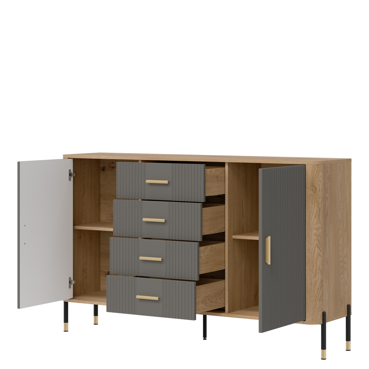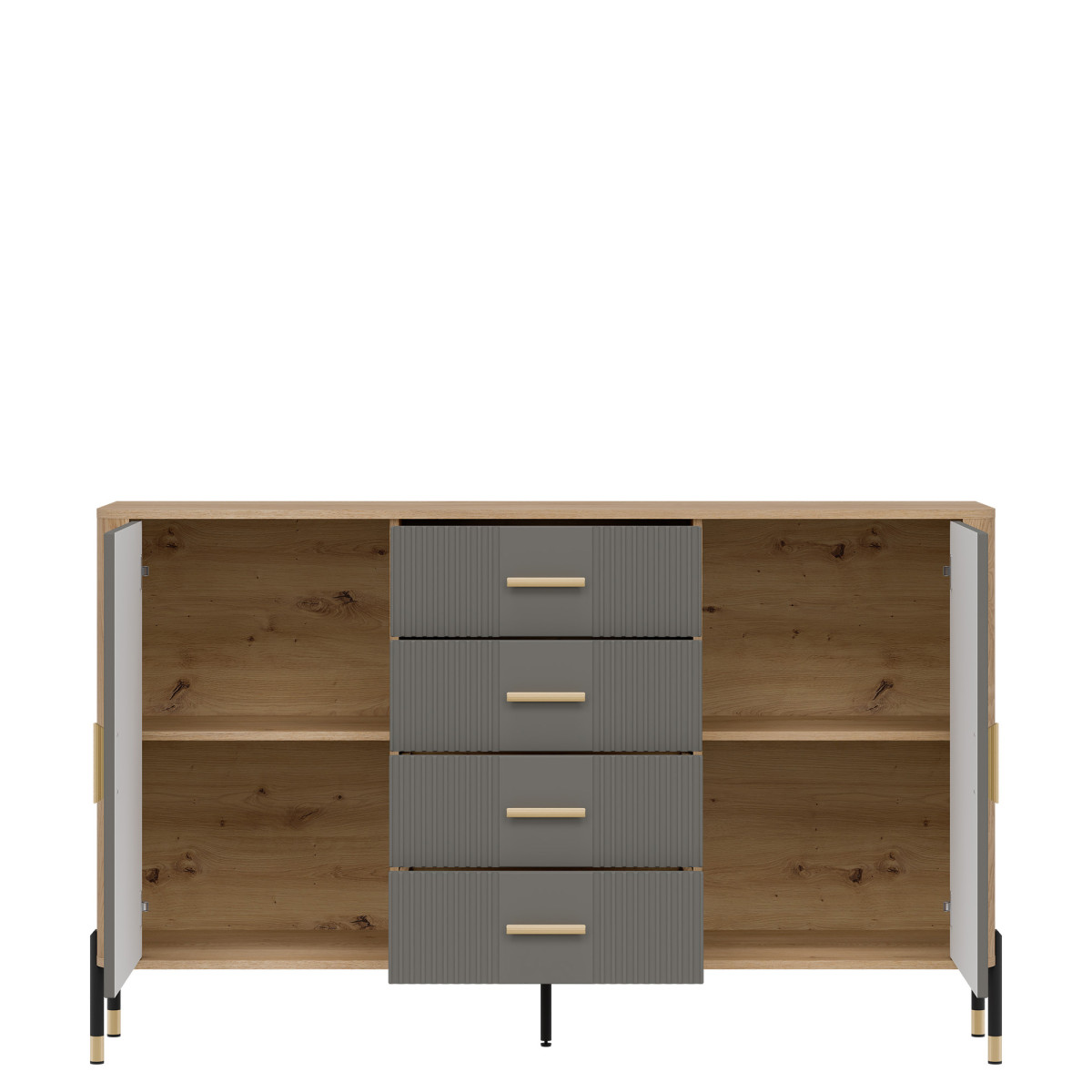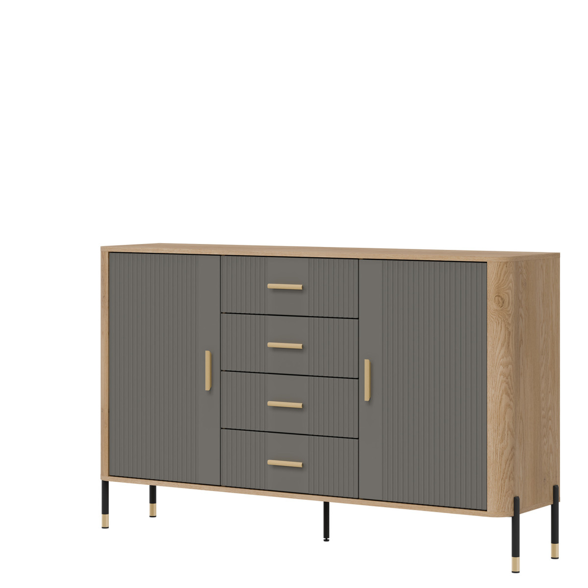 Комод Dante DT09 – гармония пропорций, стиля и вместительности. Этот предмет мебели идеально подойдет тем, кто ищет сочетание элегантности, функциональности и исключительного внимания к деталям. Разработанный для современных интерьеров, где стиль и практичность идут рука об руку, комод имеет четыре симметрично расположенных ящика в центре, обеспечивающих быстрый и удобный доступ к мелким предметам, одежде и документам. По бокам расположены запирающиеся шкафы с полками, идеально подходящие для хранения более крупных предметов, таких как книги, посуда, декоративные коллекции или офисные принадлежности. Эстетика комода подчеркивается контрастным дизайном – матовые черные фасады, доступные в пяти цветовых вариантах, в сочетании с корпусом натурального древесного оттенка создают изысканную, но универсальную цветовую схему. Доступны ручки золотого или черного цвета в минималистичном стиле, а металлические ножки с черно-золотой отделкой завершают образ, добавляя изящную элегантность и легкость. Комод Dante DT09 определяет стиль вашего интерьера. Независимо от того, отдаете ли вы приоритет функциональности или дизайну, комод DT09 обеспечит и то, и другое. Это предмет мебели, который не только организует пространство, но и служит уникальным декоративным элементом.