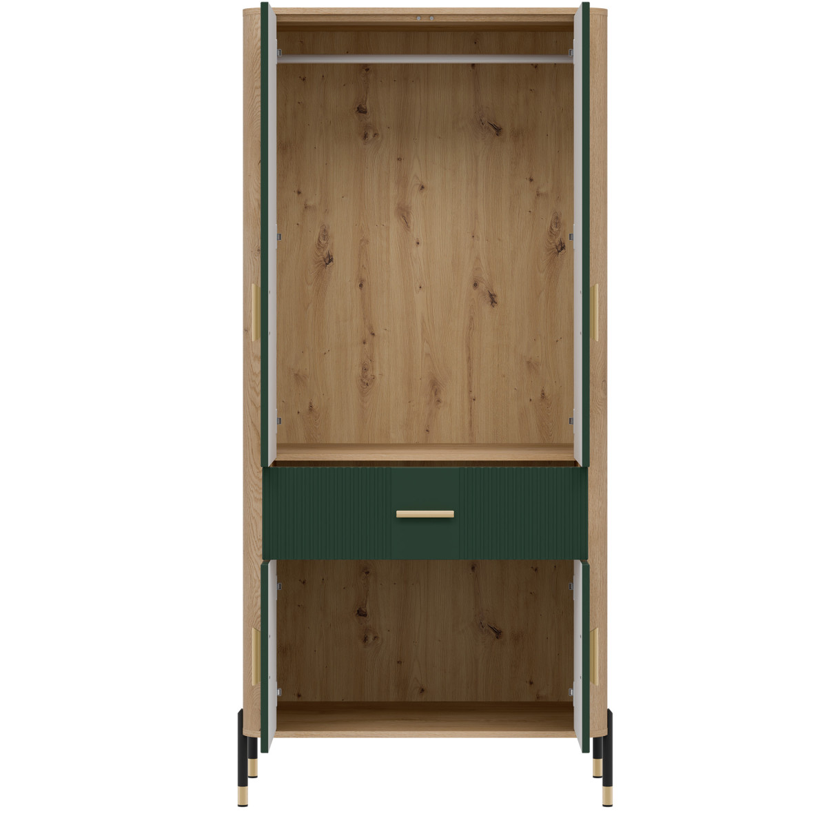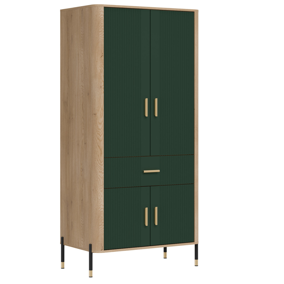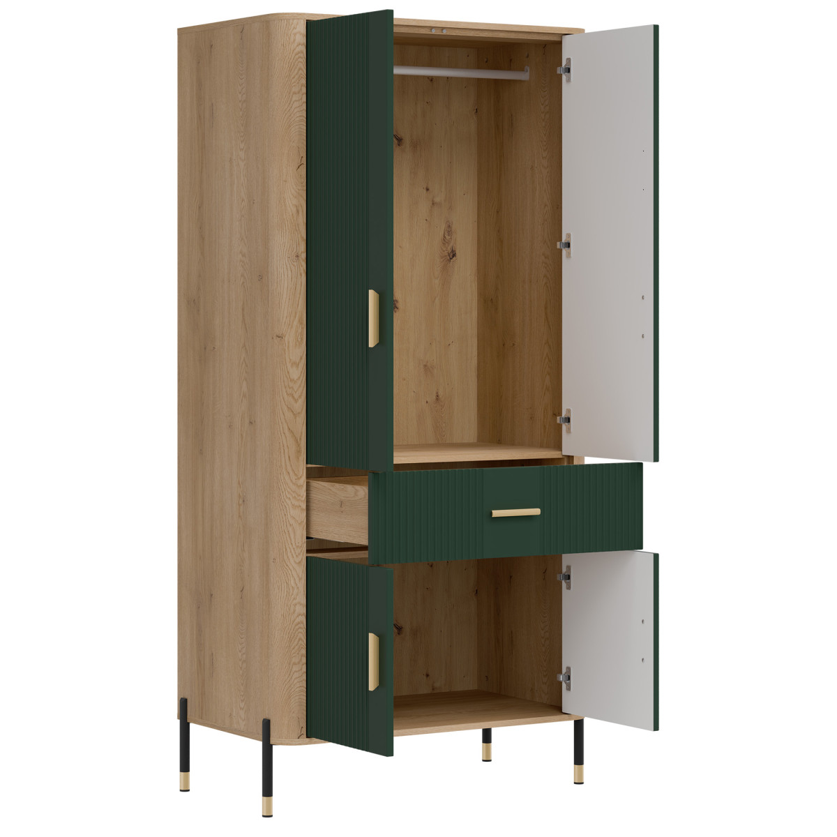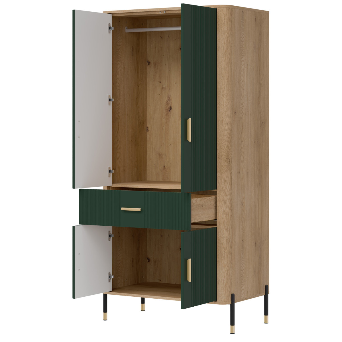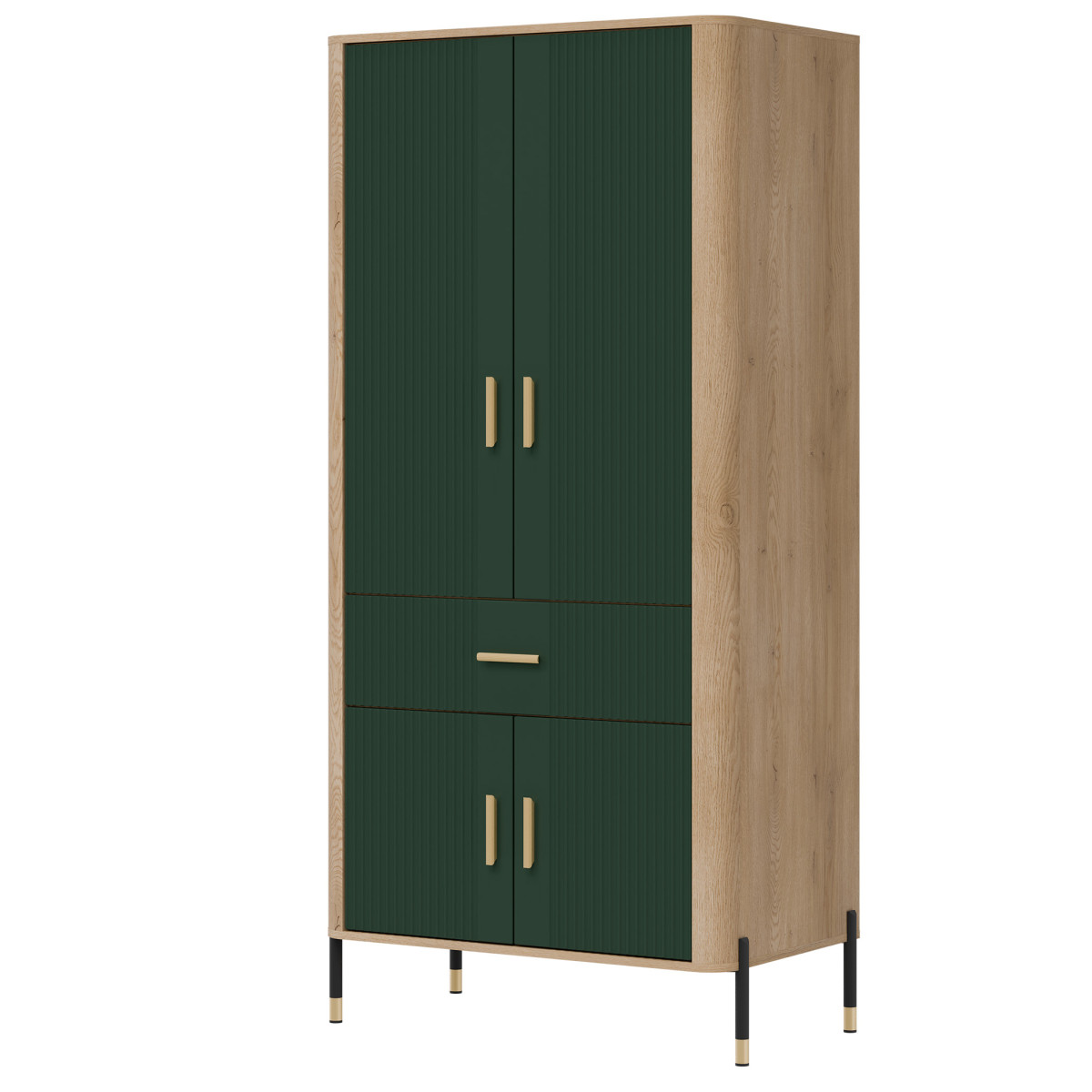 Ширина 93 см, глубина 56,5 см, высота 197 см, вес изделия с упаковкой 73,00 кг. Код производителя / символ DT16. Название коллекции DANTE. Название в системе b2b: DANTE DT16 CREMONA OAK T/MATT GREEN WARDROBE 2D SET. Количество упаковок: 5. Стиль: Модерн. Комплектация: Инструкция по сборке / аксессуары для сборки. Сборка: Самостоятельная сборка. Цвет корпуса: Cremona Torro Oak. Материал корпуса / тип / толщина: ДСП 16 мм / Плита МДФ 32 мм. Материал верхней части корпуса / тип / толщина: ДСП 16 мм. Материал нижней части корпуса / тип / толщина: ДСП 16 мм. Материал задней стенки / тип / толщина: ДСП HDF 2,5 мм. Цвет видимой части задней стенки: Artisan Oak. Цвет фасада: Матовый зеленый. Материал фасада / тип / толщина: ДСП МДФ 18 мм. Передняя петля: 35 мм, регулируемая в трех плоскостях. Передняя ручка / отделка / цвет: Металл / Черный или золотой. Система плавного закрывания дверей: В стандартной комплектации. Система плавного закрывания ящиков (в стандартной комплектации) Направляющие для ящиков Favorit Q2 Ножки / отделка / цвет Нерегулируемые / металл / черно-золотой Высота ножек 118 мм Количество дверей 4 Количество ящиков 1 Количество закрытых ниш 2 Комплектация (в стандартной комплектации) 1 вешалка для одежды