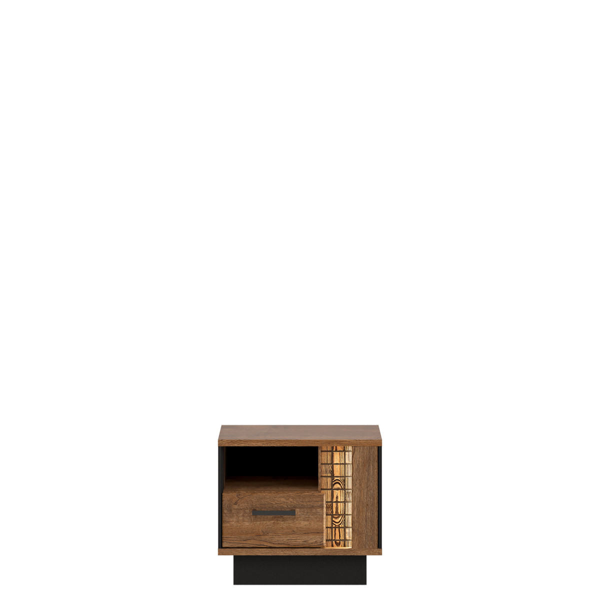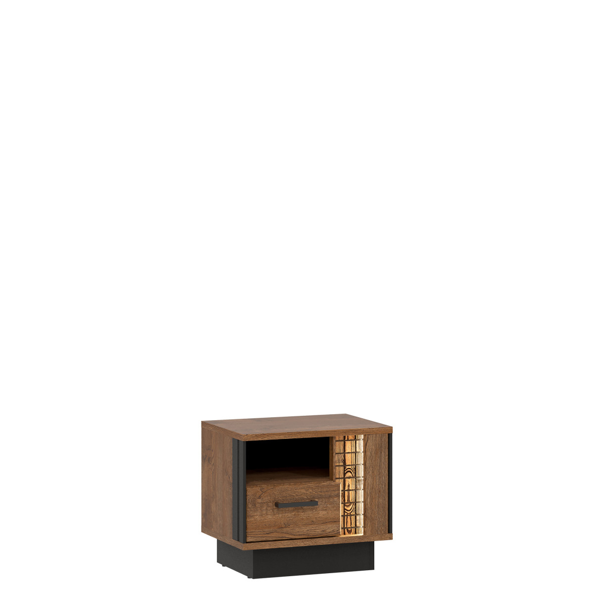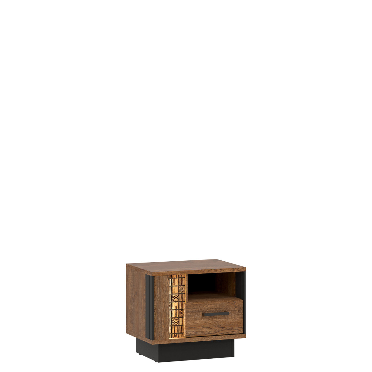 Прикроватная тумба DORIAN DN15 очаровывает своей простотой и элегантностью, органично вписываясь в любой интерьер. Идеально подходящая для спальни, она прекрасно дополняет кровать. Тумба оснащена одним выдвижным ящиком и открытым нишей для всех необходимых принадлежностей. За дополнительную плату её можно оснастить светодиодной подсветкой, которая освещает деревянные планки на передней панели, создавая мягкое свечение и уютную атмосферу. Тумба универсальна – её можно использовать как с правой, так и с левой стороны. Цветовая гамма April Oak дополнена черными акцентами, подчеркивающими общий стиль тумбы. Теплая цветовая гамма и минималистичная форма создадут привлекательный современный интерьер. Тумба идеально сочетается с другими предметами из серии DORIAN или используется как самостоятельный элемент, позволяя подобрать её под декор вашей комнаты.