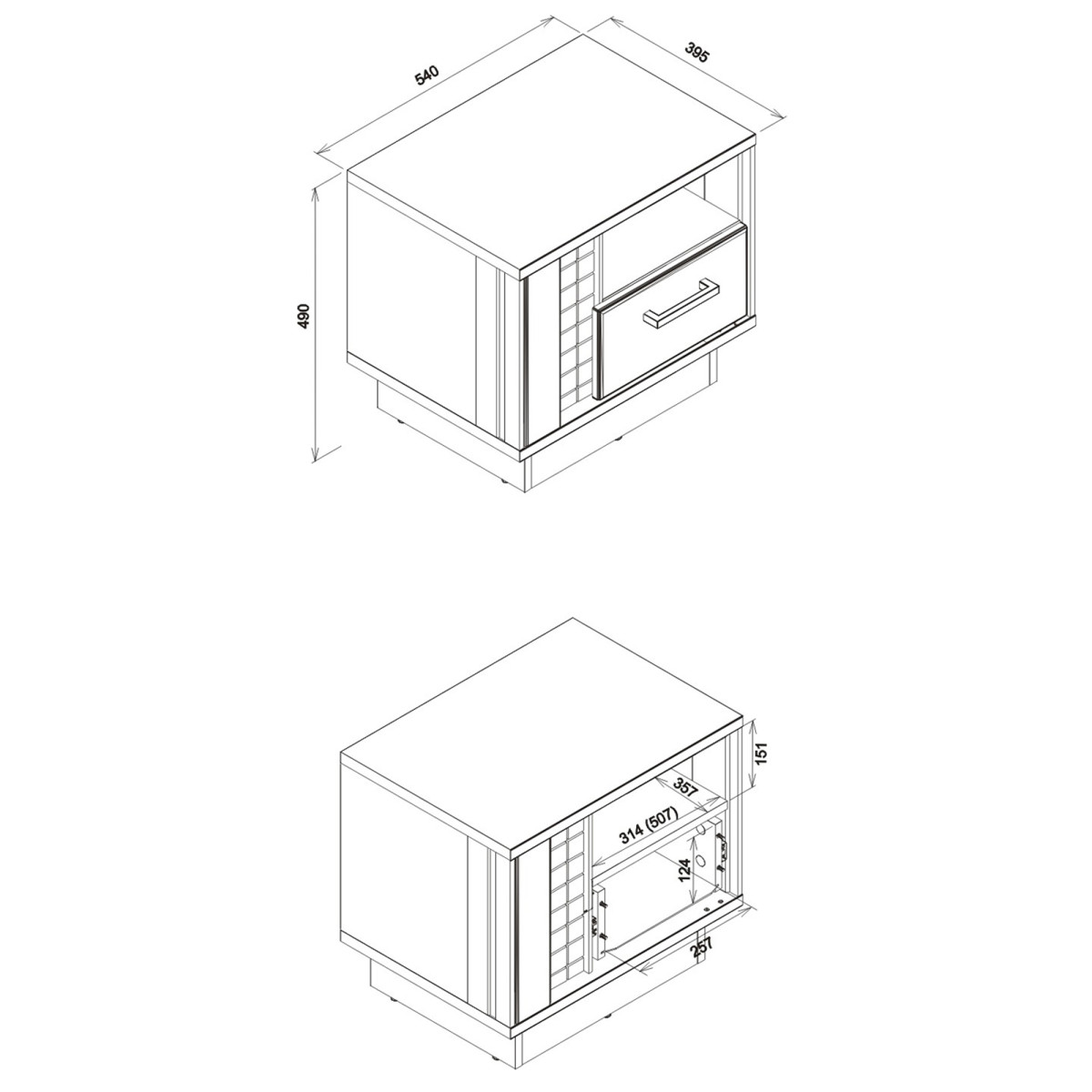 Ширина 54 см, глубина 40 см, высота 49 см, вес изделия с упаковкой 18,55 кг. Код производителя / символ DN15. Название коллекции DORIAN. Название в системе b2b: DORIAN DN-15 April Oak/Black. Комплект прикроватных тумбочек. Количество упаковок: 2. Стиль: Модерн. Комплектация: Инструкция по сборке / аксессуары для сборки. Сборка: Самостоятельная сборка. Цвет корпуса: April Oak / Black. Материал корпуса / тип / толщина: 16 мм ДСП / Полоса: 16 мм МДФ. Материал верхней части корпуса / тип / толщина: 22 мм ДСП. Материал нижней части корпуса / тип / толщина: 22 мм ДСП. Материал основания корпуса / тип / толщина: 16 мм ДСП. Материал задней стенки / тип / толщина: 2,5 мм ХДФ. Цвет видимой части задней стенки: Черный. Цвет передней панели: April Oak. Материал передней панели / тип / толщина: 18 мм МДФ. Передняя ручка / тип / цвет: Пластик / черный. Внешнее освещение: Стандартное. Цвет света внешнего освещения: Теплый белый. Класс энергоэффективности внешнего освещения: A++. Направляющие для выдвижных ящиков полного выдвижения. Ножка / тип / цвет: Нерегулируемые / Направляющие для мебели / Пластик / Черный Количество ящиков: 1 Количество открытых ниш: 1 Универсальный корпус, для левой/правой руки: ДА