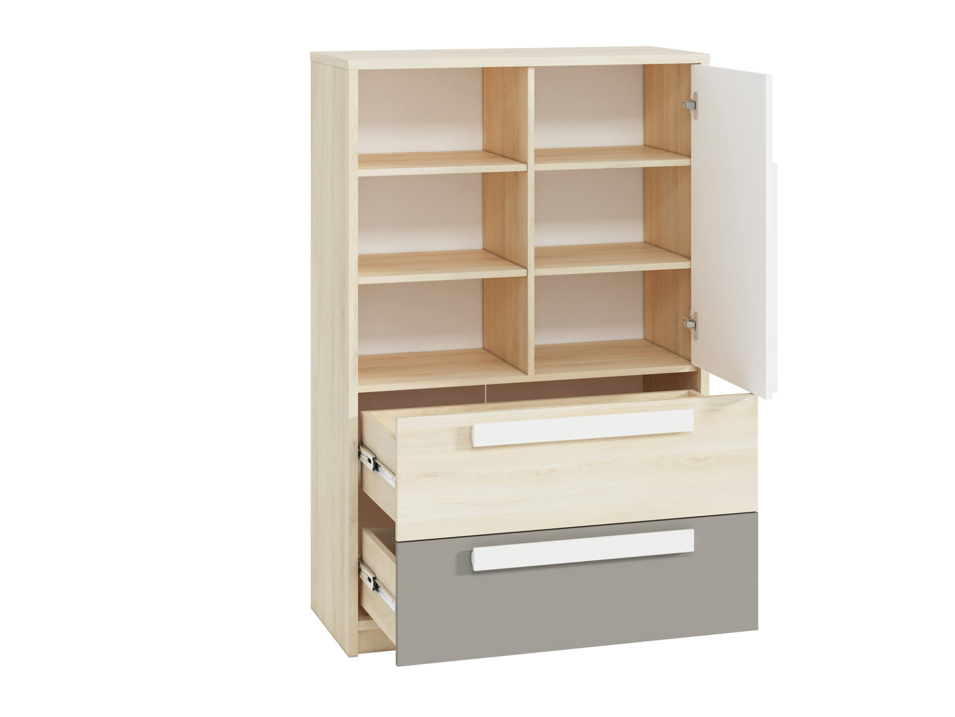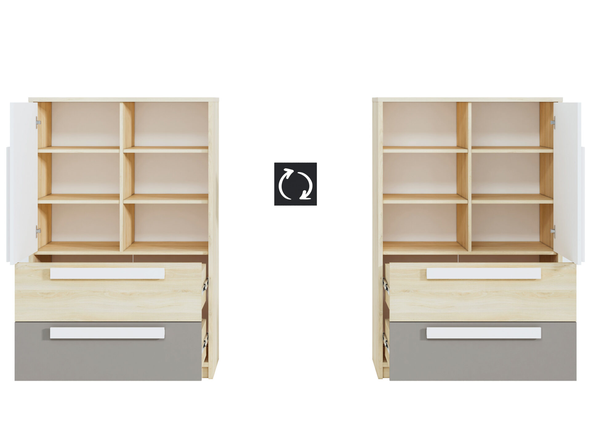 Зачастую именно гибкость расстановки мебели определяет ее покупку. Возможность установки дверей как с правой, так и с левой стороны позволяет адаптировать Drop 07 к вашим индивидуальным потребностям. Мы дополнительно усилили вместительные ящики и добавили функциональные системы полного выдвижения. Деревянные ручки имеют закругленную форму и безопасны для детей. Конструкция полностью безопасна и сбалансирована.