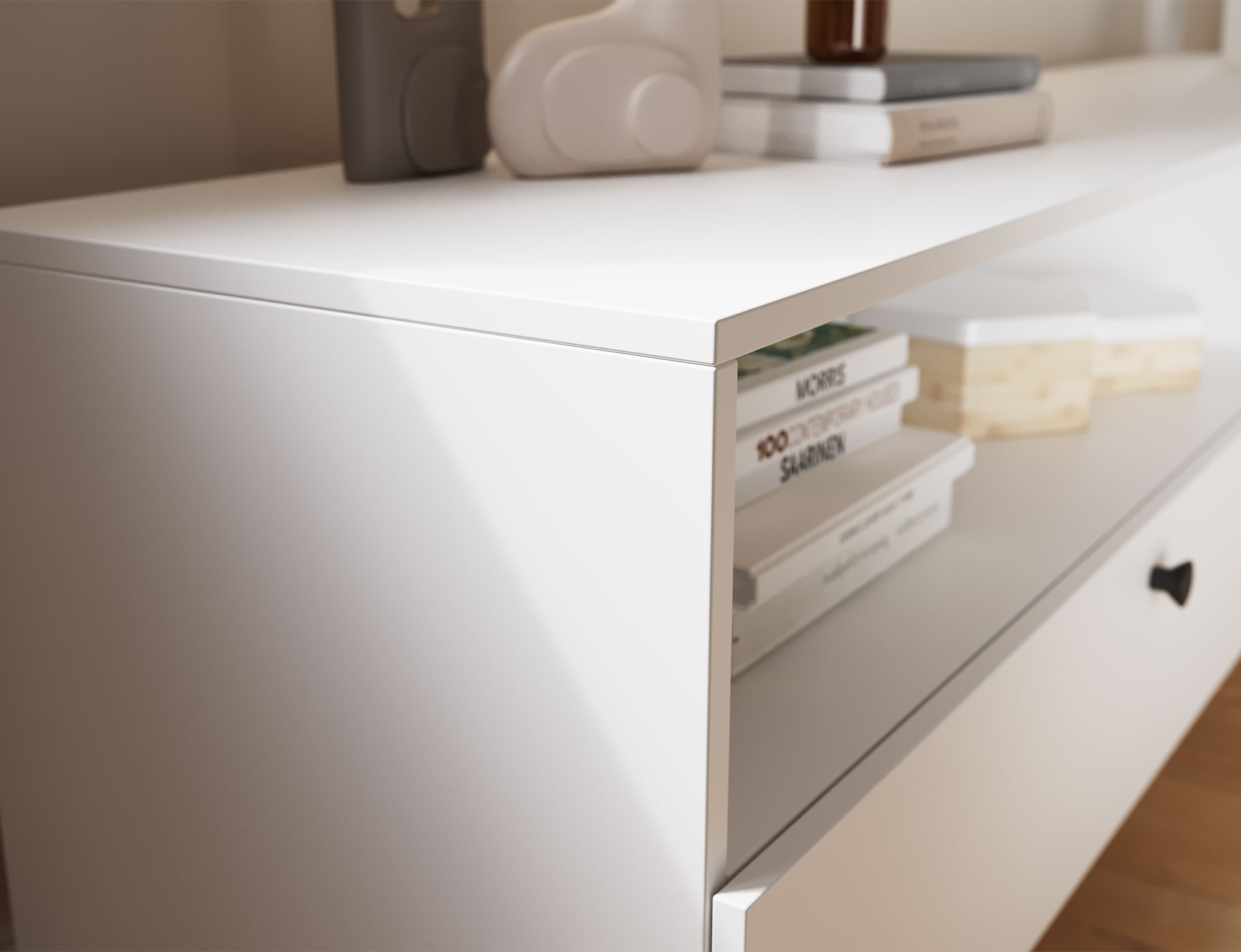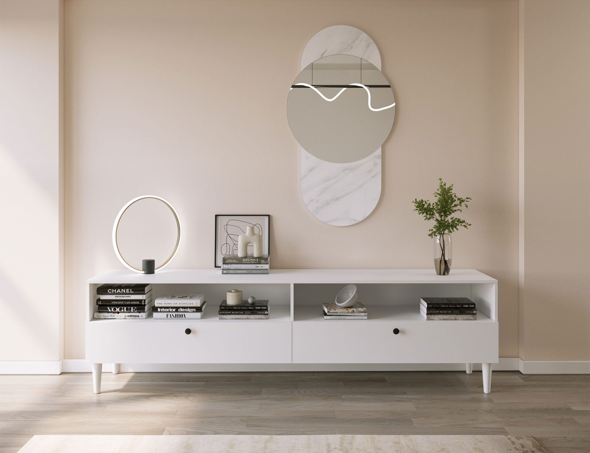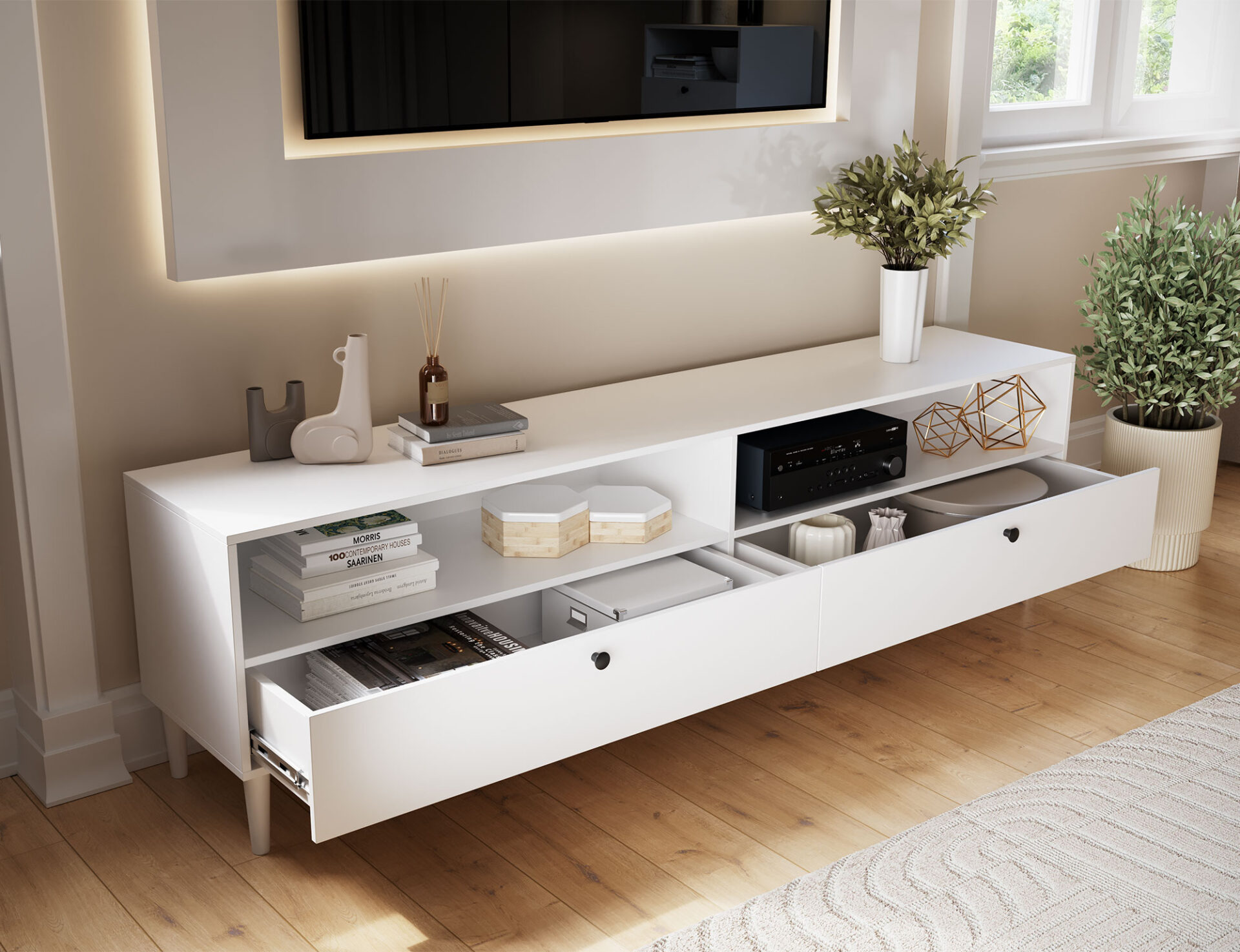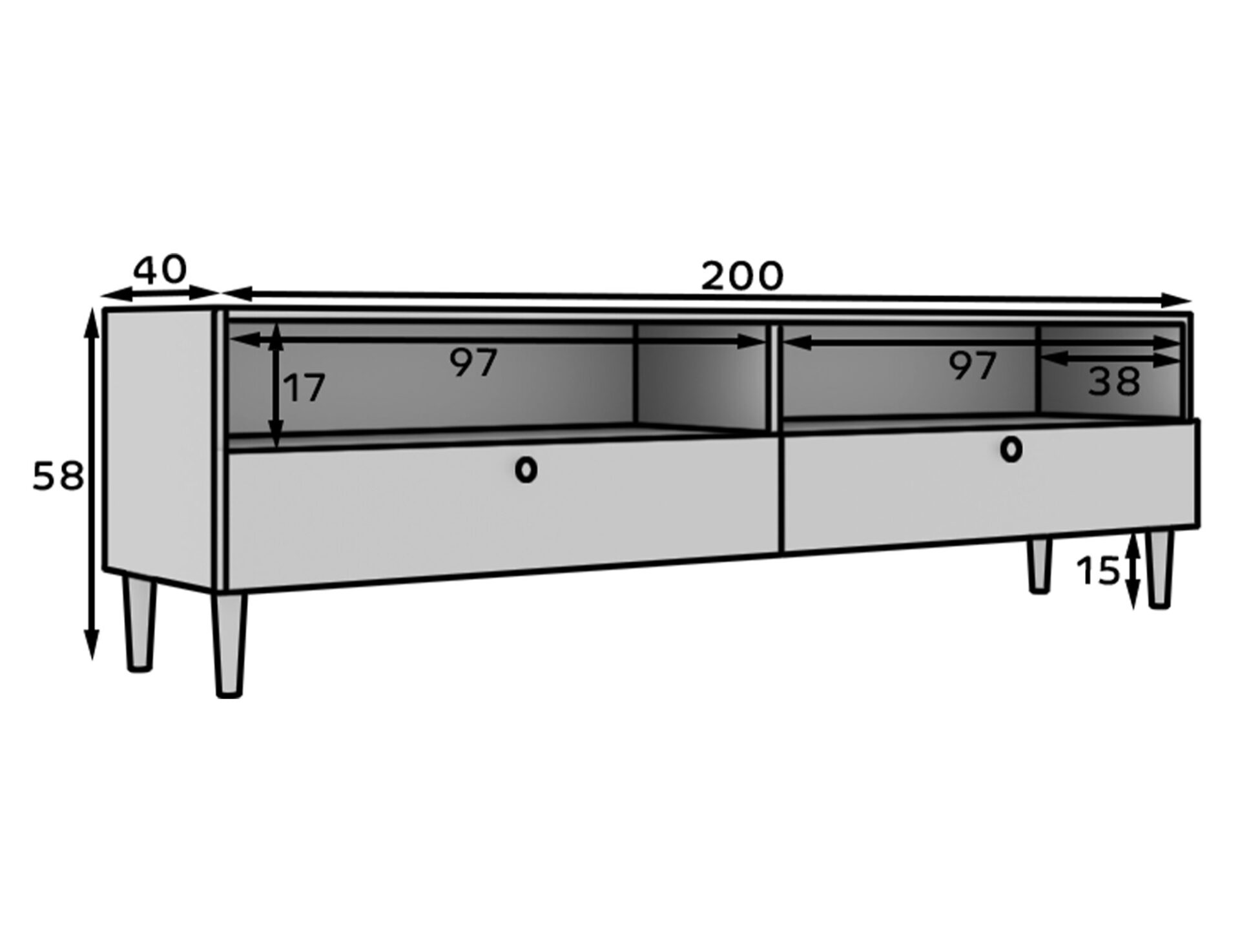 Тумба под телевизор Dullum — это элегантный и функциональный предмет мебели размером 40 см в глубину, 200 см в ширину и 58 см в высоту. Она оснащена двумя открытыми полками и двумя выдвижными ящиками, обеспечивающими удобное хранение телевизионной техники и других необходимых вещей. Современный дизайн и практичная компоновка делают её идеальным дополнением к различным интерьерам, добавляя стиля и элегантности.