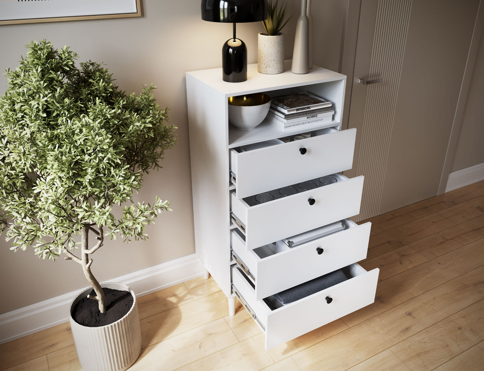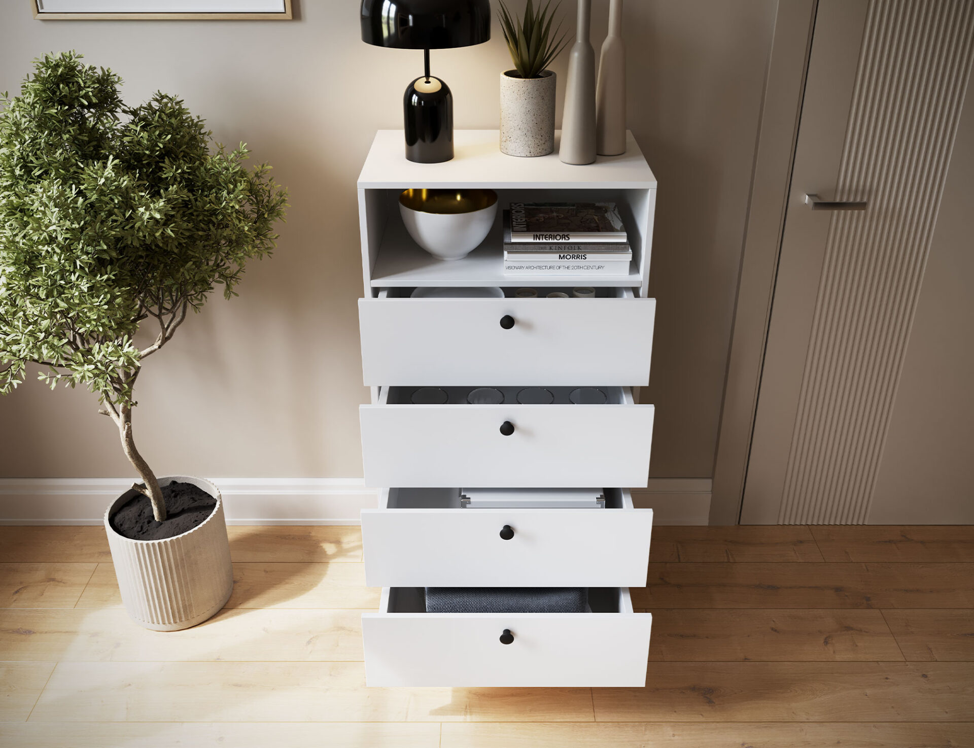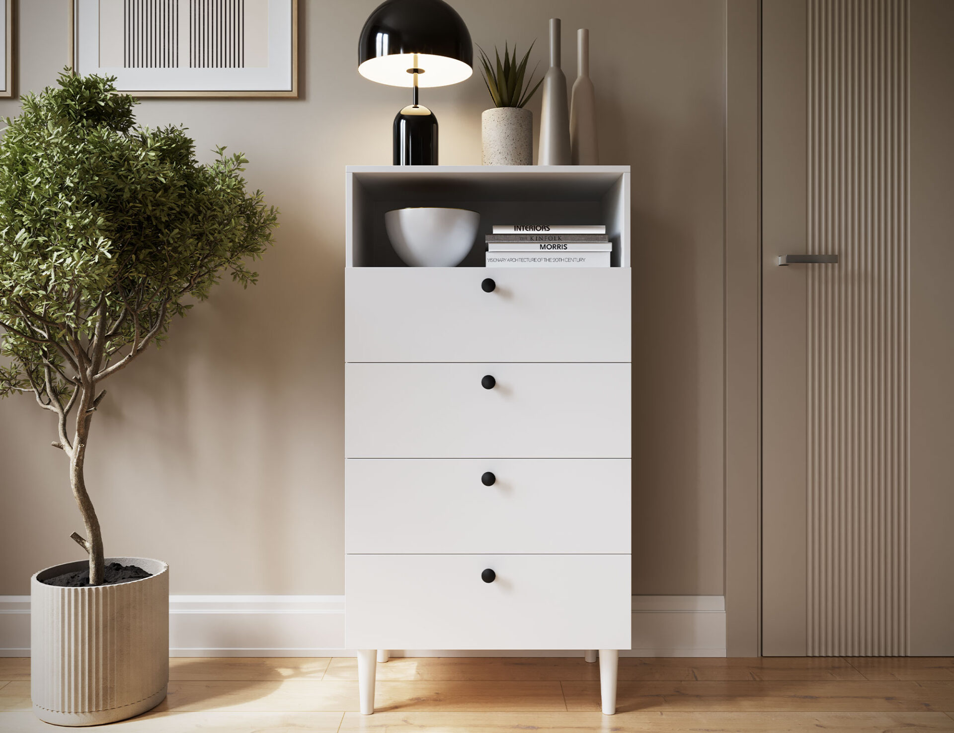 Книжный шкаф Dullum — это стильный и практичный предмет мебели размером 40 см в глубину, 60 см в ширину и 115 см в высоту. Он имеет одну открытую полку и четыре выдвижных ящика для хранения различных предметов. Книжный шкаф опирается на деревянные ножки высотой 15 см, что придает ему легкость и элегантность. Каждый ящик выдерживает максимальную нагрузку до 3 кг, что делает его функциональным, но при этом прочным и устойчивым.