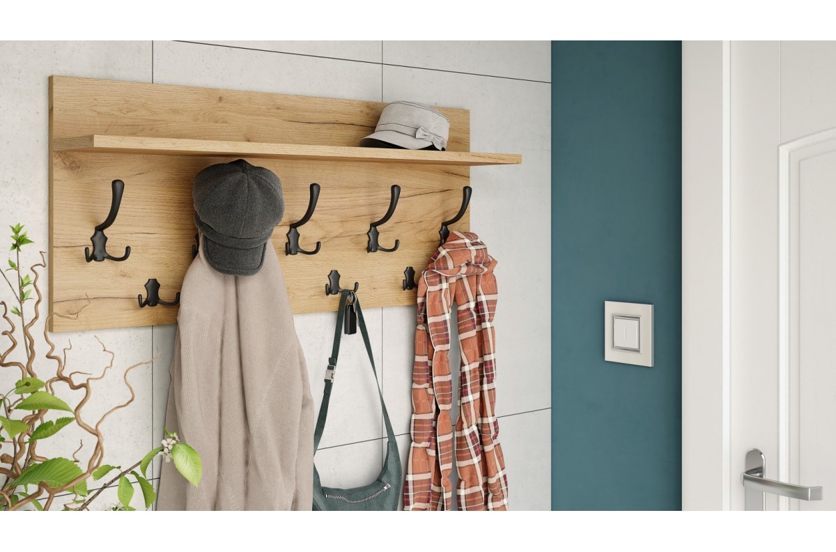 FINLO auksinės amatų ąžuolo / matinės juodos spalvos rankenėlės – MODERNUS SIENINIS PAKABINIMAS SU LENTYNA PRIEŠKORIUI 90 ir 70 cm