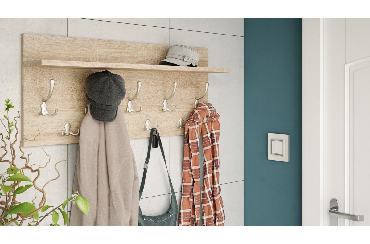 FINLO Sonoma ąžuolo/satininio nikelio rankenėlės – MODERNUS SIENINIS PAKABINUKAS SU LENTYNA KORDIUMUI 90 ir 70 cm