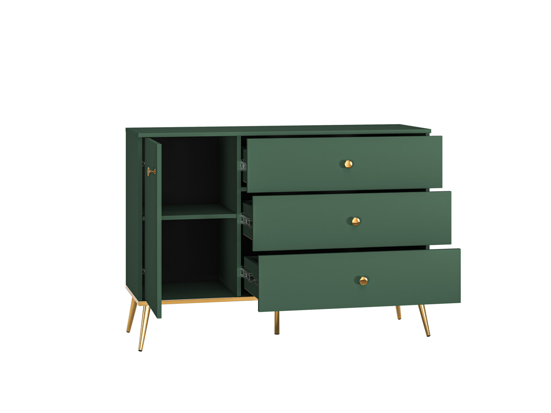 Комод Forest 04 идеально подойдет для современной гостиной или спальни. Верхняя часть позволяет разместить ваши любимые предметы: вазы, лампы или сувениры из путешествий. За дверцами расположены две просторные полки, идеально подходящие для хранения полотенец, скатертей или другого домашнего текстиля. Вторая половина комода состоит из трех больших и вместительных ящиков – идеально подходящих для хранения столовых принадлежностей, таких как столовые приборы, одежда или нижнее белье в спальне. Вся мебель коллекции Forest выполнена в гармоничном зеленом цвете – Labrador. Ручки, ножки и шпон нижней панели – благодаря своему классическому золотому цвету – подчеркивают элегантный и вневременной характер мебели Forest.