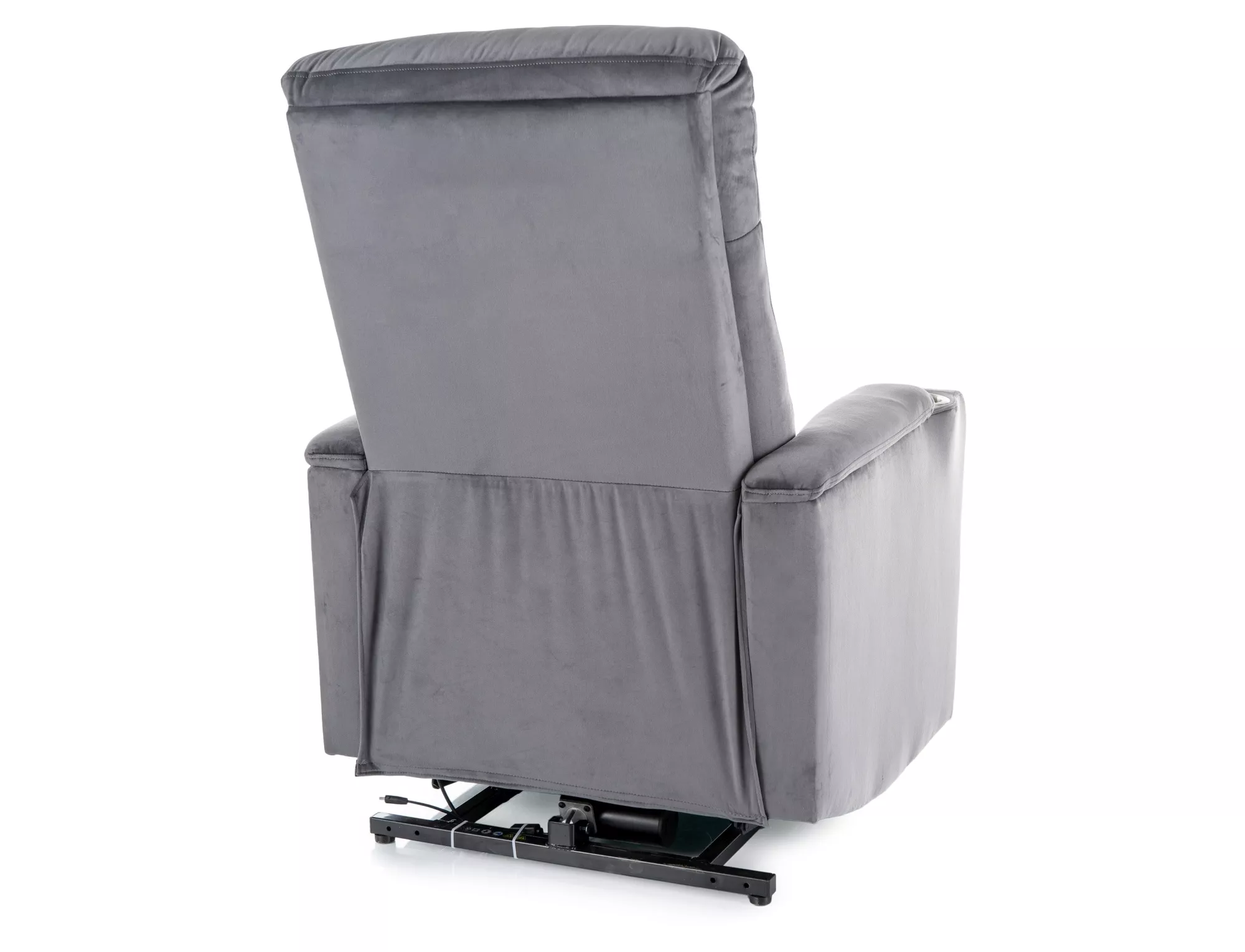 Электрическое кресло-реклайнер, обивка из бархата: Bluvel 14, каркас: металл, цвет: серый/черный. Подстаканник, практичный карман справа, проводной пульт дистанционного управления. Размеры кресла: A – 108, B – 77, C – 49, D – 55, E – 92, деление 163, F – 5 см