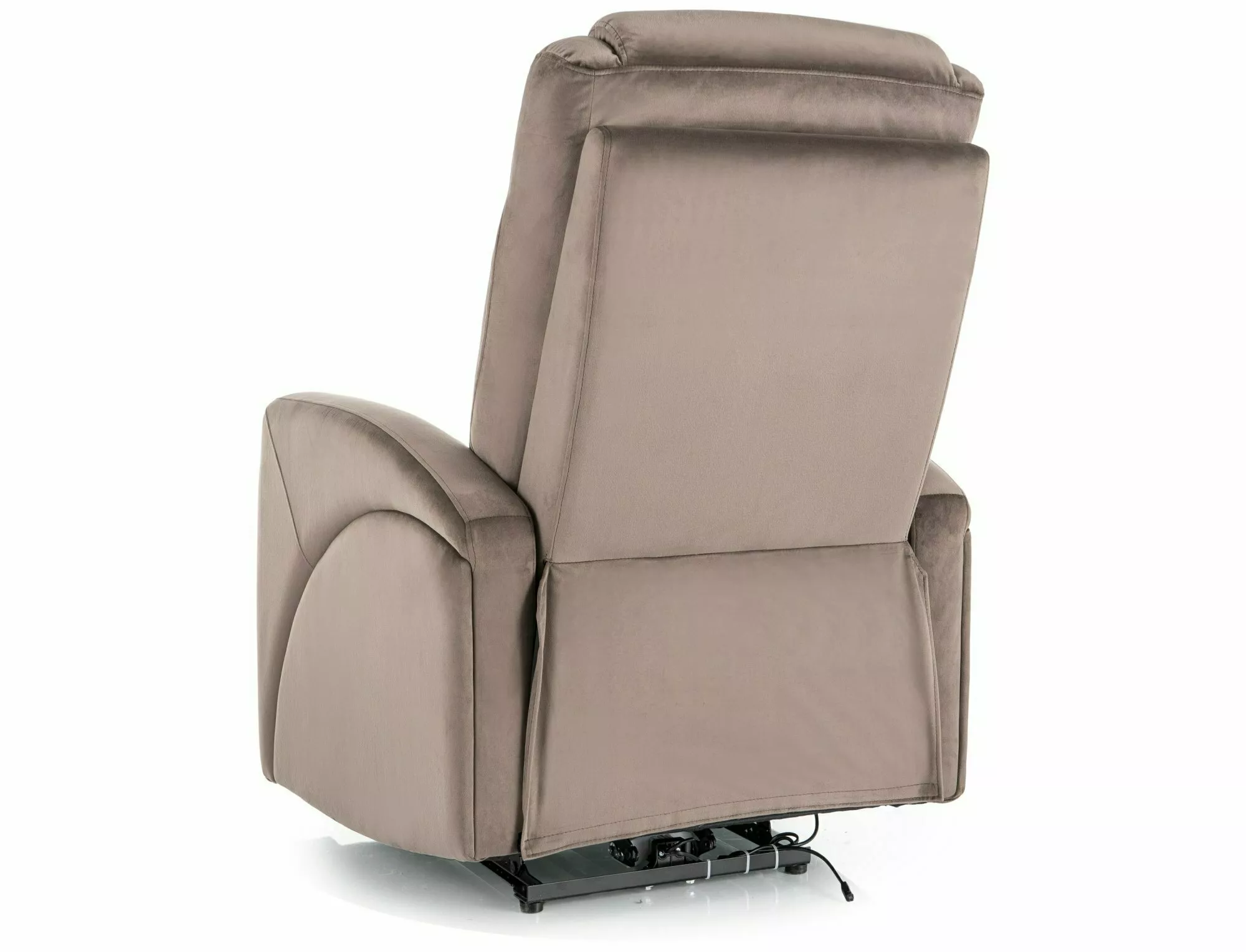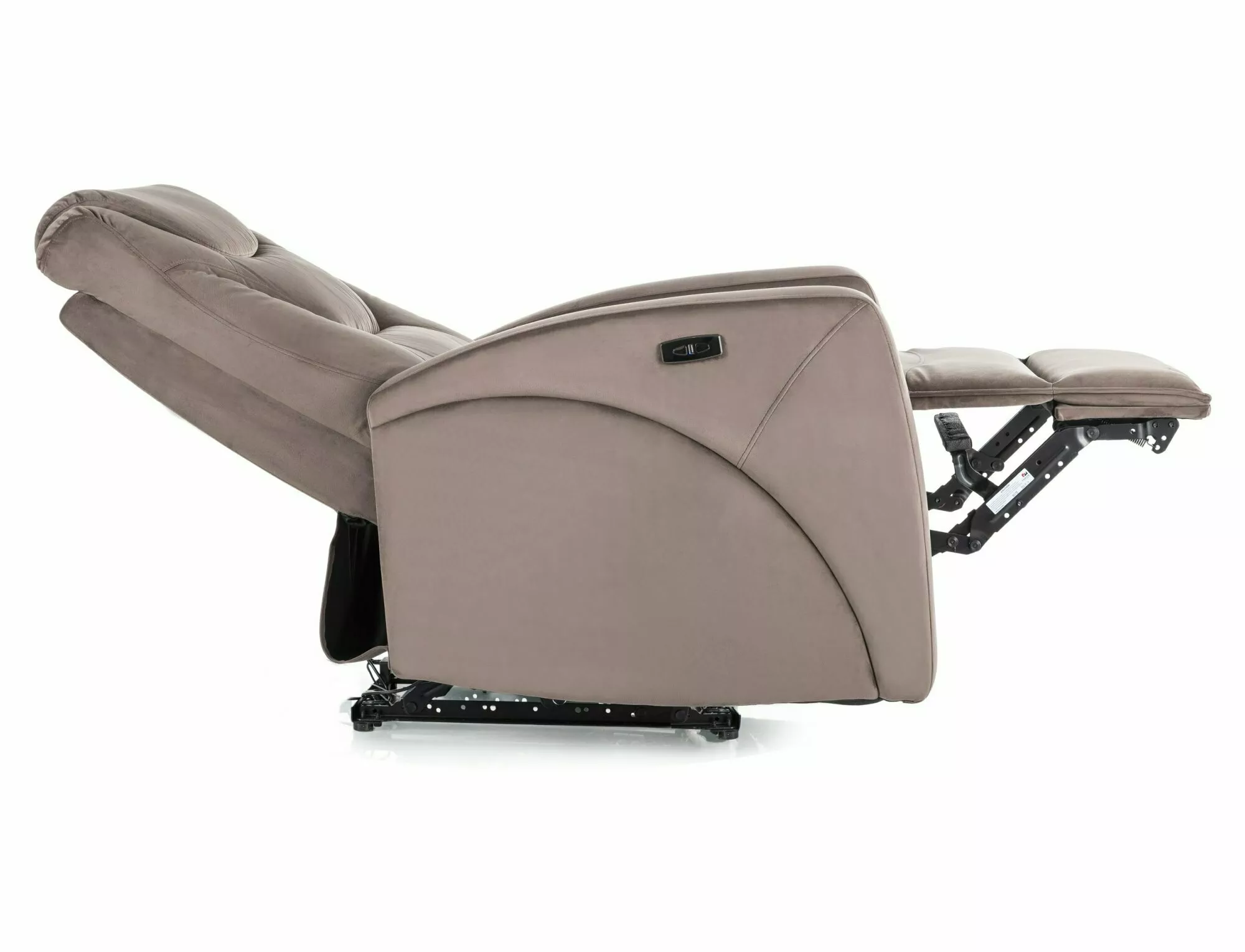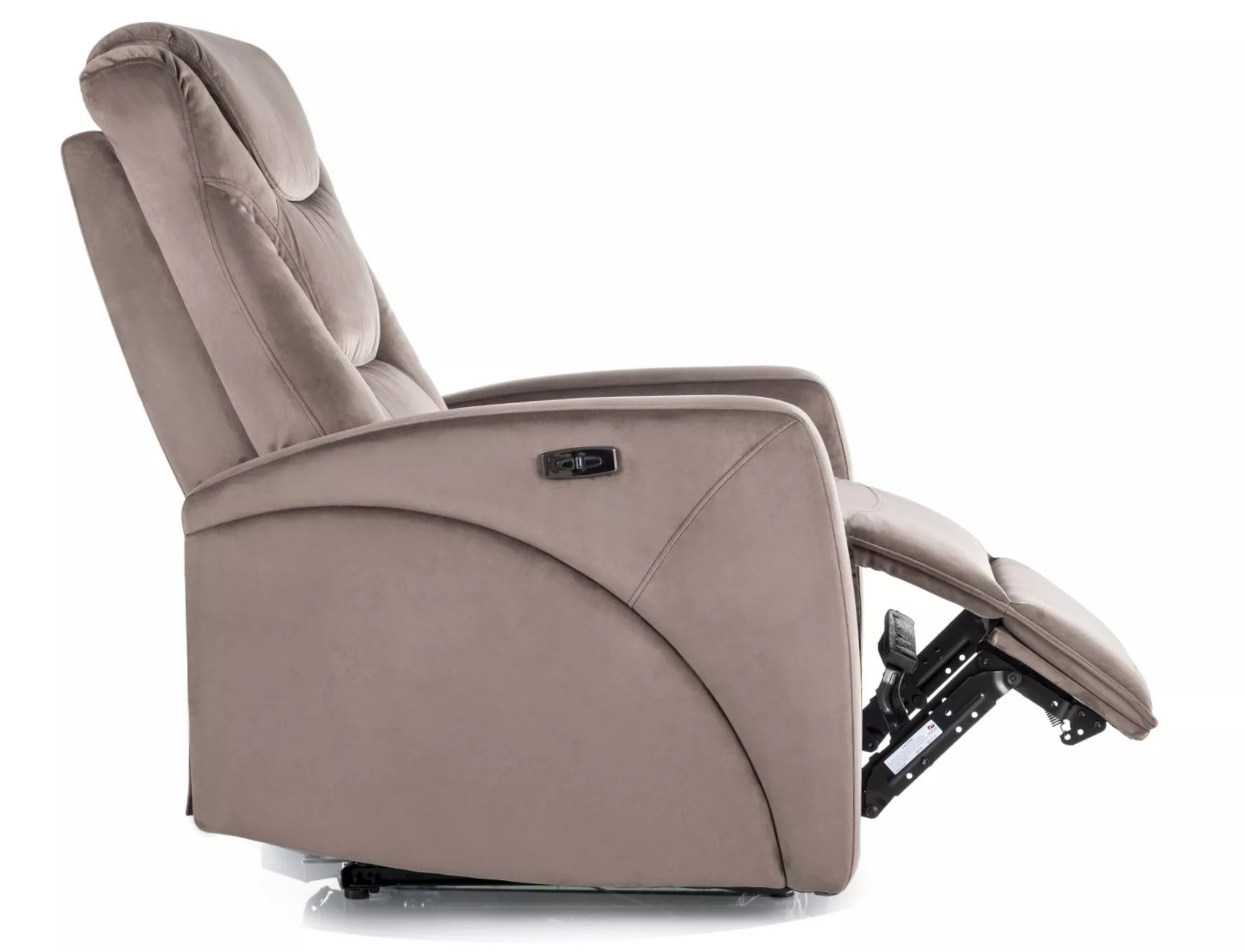 Электрическое кресло-реклайнер, обивка из бархата: Bluvel 38, каркас: металл, цвет: капучино/черный. Регулировка наклона осуществляется кнопками с правой стороны, USB-порт. Размеры кресла: A – 107, B – 79, C – 49, D – 53, E – 94÷160, F – 5 см