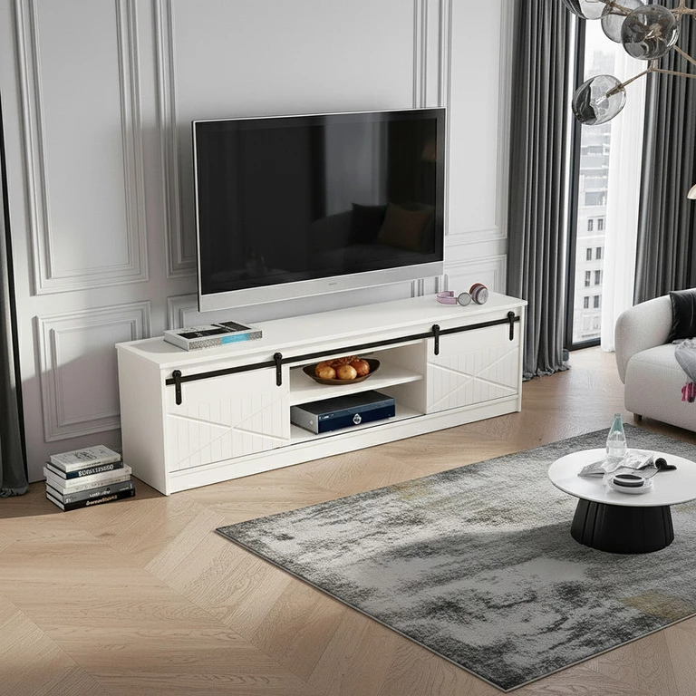 Тумба под телевизор GRANERO с раздвижными дверцами, белого цвета.