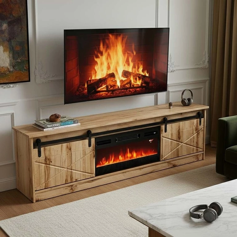 Тумба под телевизор GRANERO с раздвижными дверцами из древесины вотанского дуба, с камином.
