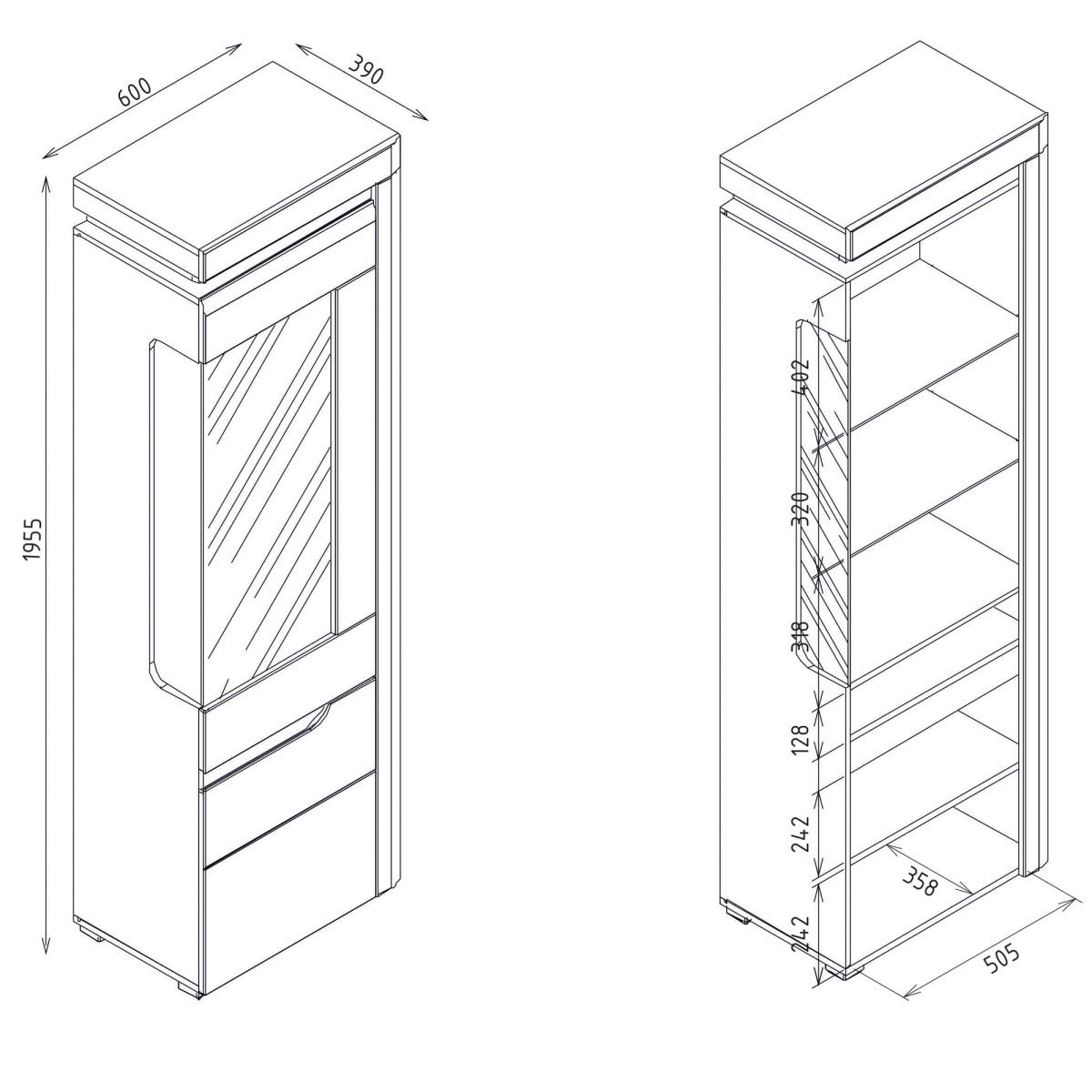 Ширина 60 см, глубина 39 см, высота 195,5 см, вес изделия с упаковкой 56,25 кг. Код/символ производителя IM07. Название коллекции IRMA. Название в системе b2b: IRMA IM-7 белый/белый глянцевый, d.magia. Дисплей P set. Количество упаковок: 3. Стиль: Модерн. Комплектация: Инструкция по сборке / аксессуары для сборки. Сборка: Самостоятельная сборка. Цвет корпуса: Белый. Материал отделки корпуса: 16 мм, мебельная плита / планка: 18 мм, мебельная плита МДФ. Верхняя часть корпуса: материал отделки, тип и толщина: 16 мм, мебельная плита. Нижняя часть корпуса: материал отделки, тип и толщина: 16 мм, мебельная плита. Цвет полок: Белый. Материал отделки полок: 16 мм, мебельная плита. Количество полок: 2. Материал отделки задней стенки: 2,5 мм, мебельная плита ХДФ. Цвет видимой части задней стенки: Белый. Цвет передней части: Белый глянцевый. Материал отделки передней части: 18 мм, мебельная плита МДФ. Передняя петля: ⌀ 35 мм, регулировка в трех плоскостях. Передняя ручка. / отделка / цвет Фрезерованный / Глянцевый белый Отделка передней панели / цвет стекла Закаленное / прозрачное Толщина переднего стекла 4 мм Цвет стекла полки Прозрачное Толщина стекла полки 6 мм Количество полок 2 Внутреннее освещение Стандартное Цвет света внутреннего освещения Холодный белый Класс энергоэффективности внутреннего освещения A++ Наружное освещение Стандартное Цвет света наружного освещения Холодный белый Класс энергоэффективности наружного освещения A++ Система плавного закрывания дверей Стандартная Ножка / отделка / цвет Регулируемая / пластик / никель Количество дверей 2 Количество ниш, закрывающихся за передним стеклом 3 Количество ниш, закрывающихся 3 Комплектация корпуса Декоративный элемент двух цветов